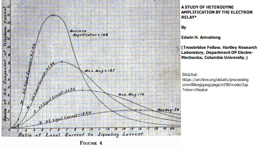 Auf der x-Achse hat Armstrong das Verhältnis von Überlagerer-Strom zu Empfangsstrom eingetragen, auf der y-Achse die Stärke des demodulierten Signals.