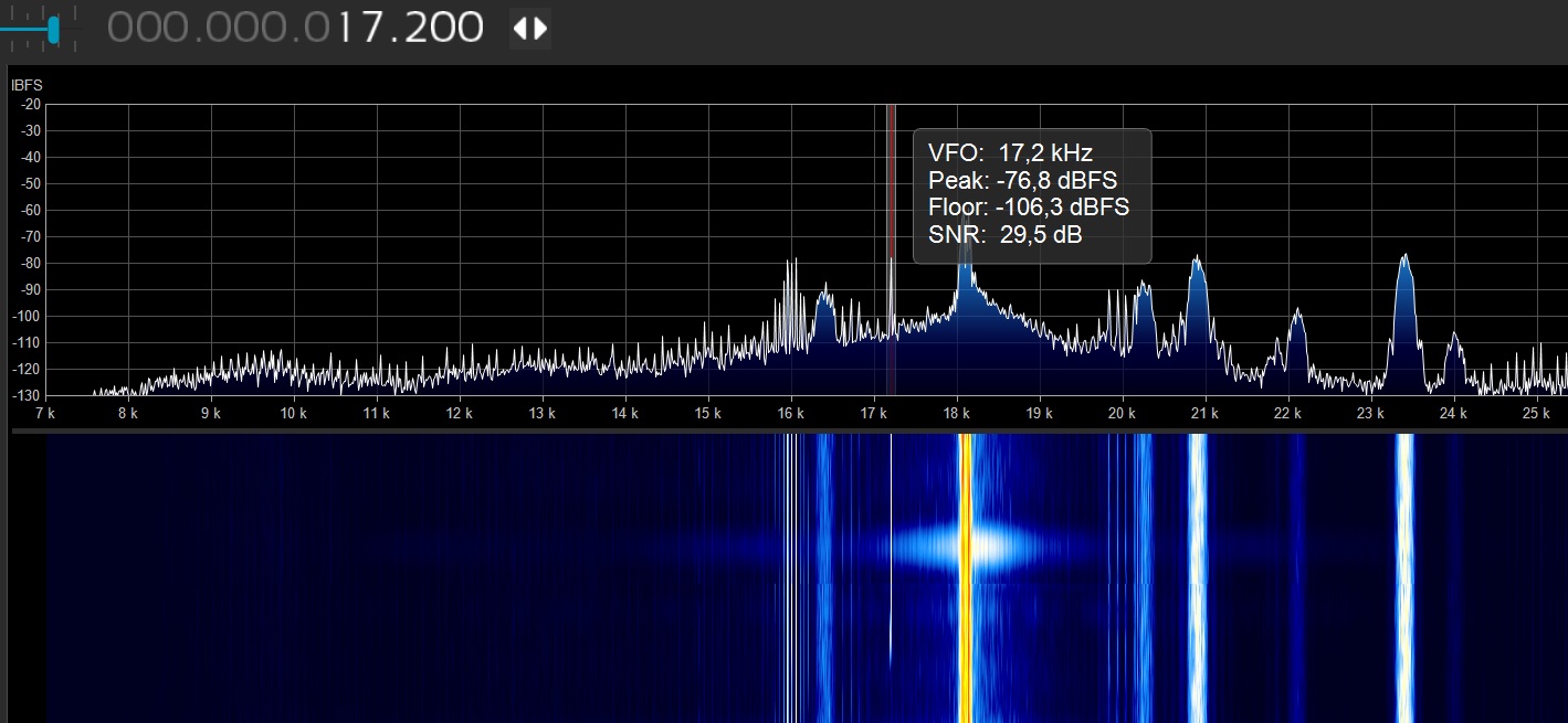 Schön zu sehen ist bei dir der „elendige Störer“ auf 18 kHz. Wo ist dein Standort? Das Signal auf 23,5 kHz könnte Rhauderfehn sein? Bei mir in MV knallt der richtig rein.
