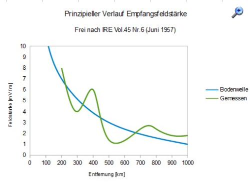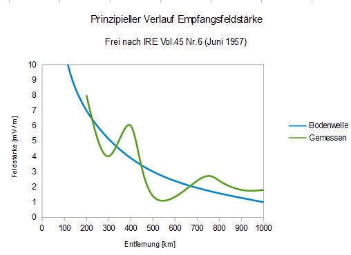 bis etwa 1500 km wird es kompliziert. - In etwa 70km reflektiert die D-Schicht und auch der Erdboden bzw. Seewasser die sehr langen Wellen, am Emfangsort kommt es zur Überlagerung mit der Bodenwelle. Komplizierte Modelle wurden erstellt und stimmen gut mit den gemessen Werten überein.