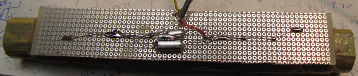 Die Schaltung ist in ein mit Masse verbundenes Weißblechgehäuse gelötet. Das "Gehäuse" ist erstmal eine Eisverpackung.