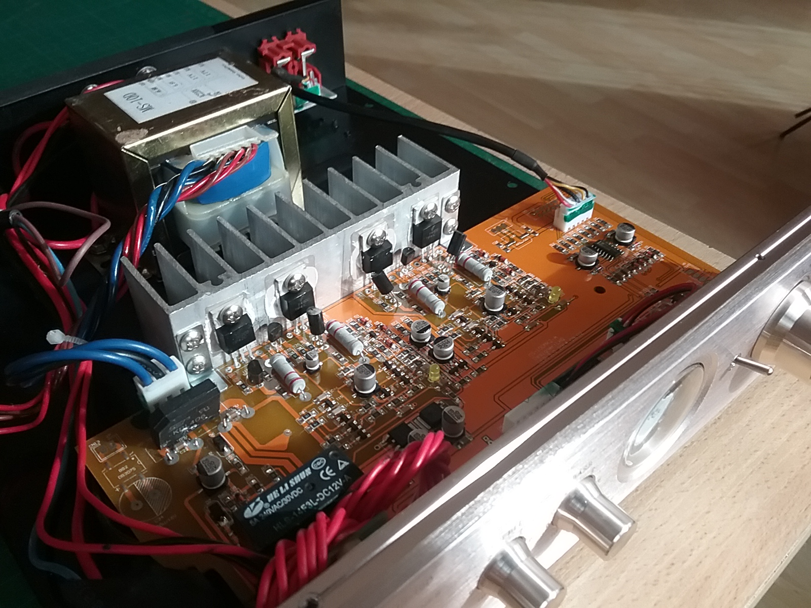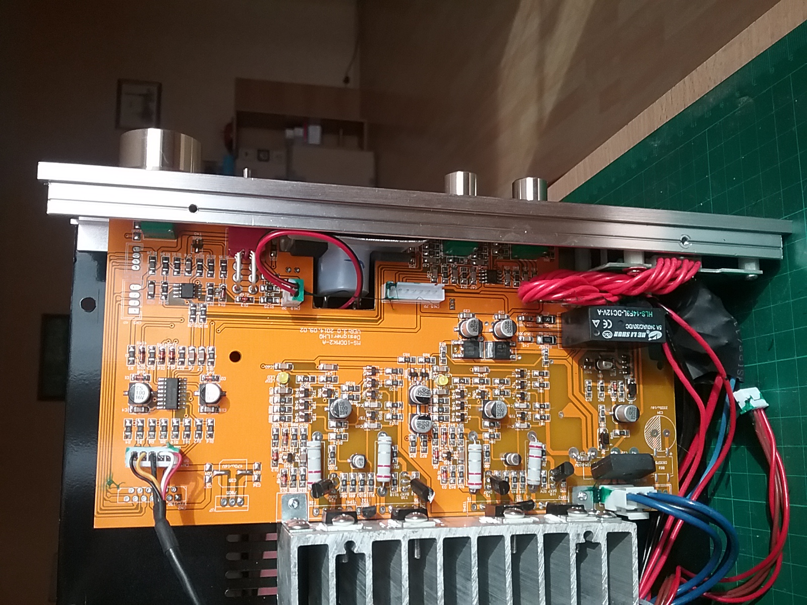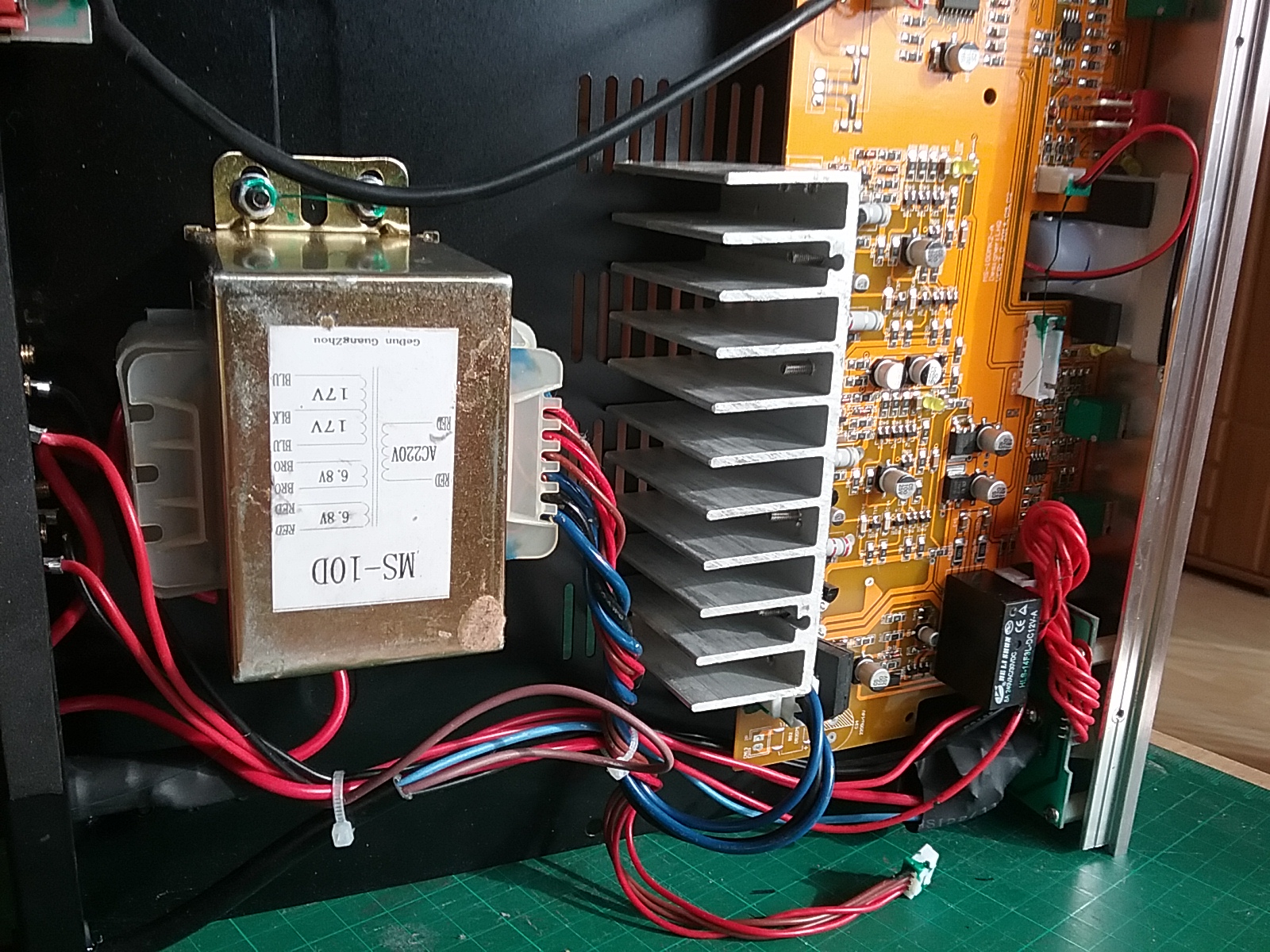 Die Hauptplatine zeigt brav die 4 Endstufen-Transistoren auf Kühlkörper. Sollte die Röhrenplatine eine technische Aufgabe haben, müsste ein Bandkabel mit zumindest 7 Leitungen vorhanden sein. Ich habe tatsächlich in dem Youtube-Video sieben Zuleitungen und nochmals 4 Zuleitungen erkennen können.