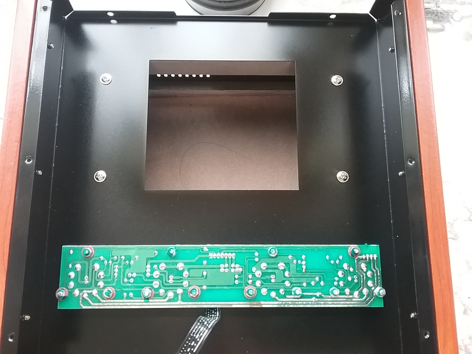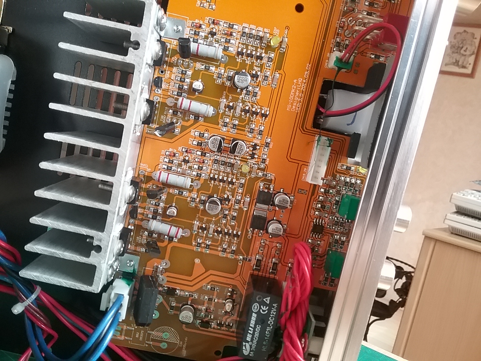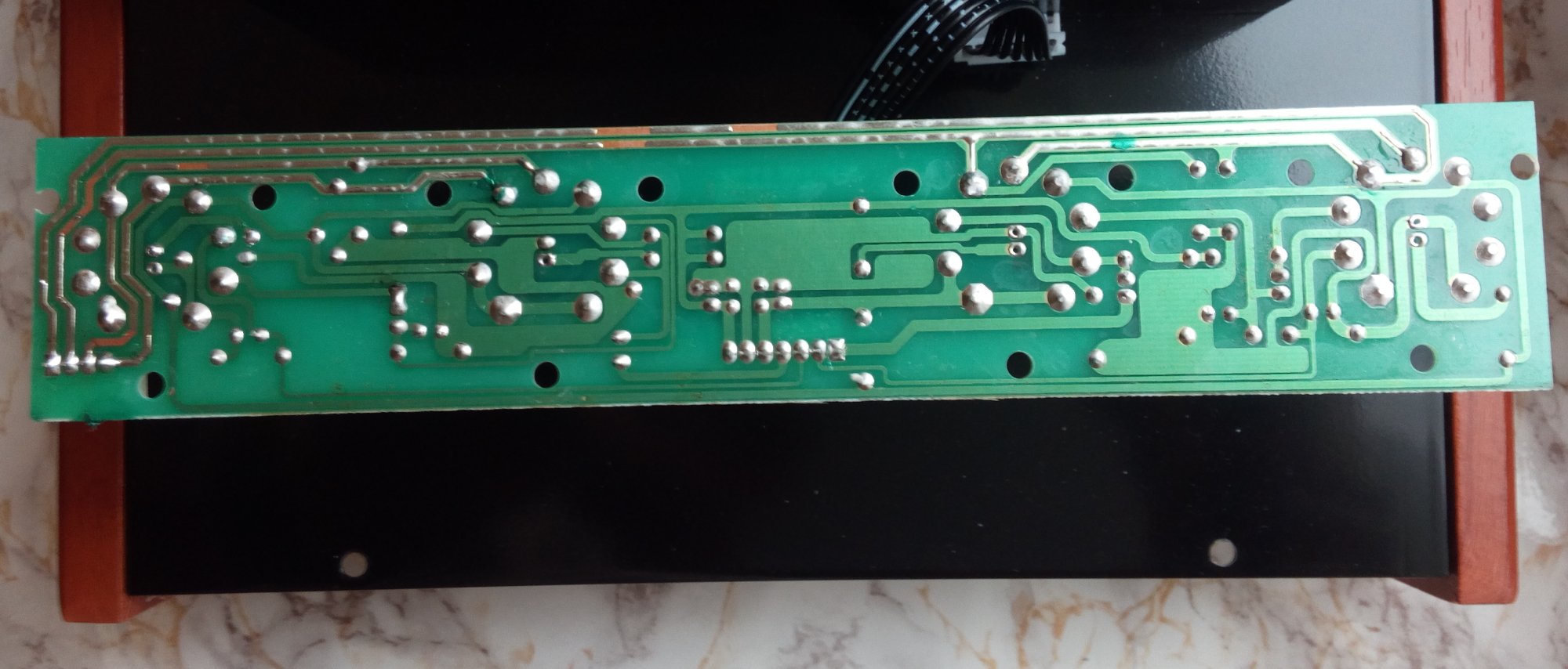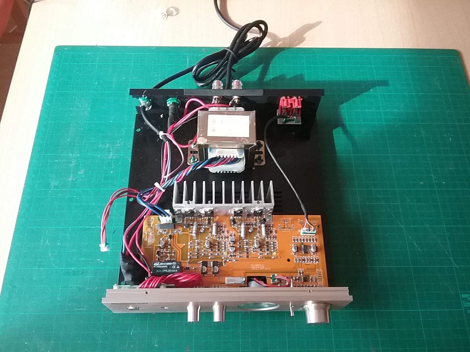Die Hauptplatine zeigt brav die 4 Endstufen-Transistoren auf Kühlkörper. Sollte die Röhrenplatine eine technische Aufgabe haben, müsste ein Bandkabel mit zumindest 7 Leitungen vorhanden sein. Ich habe tatsächlich in dem Youtube-Video sieben Zuleitungen und nochmals 4 Zuleitungen erkennen können.