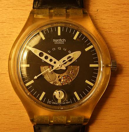 Ein ebenfalls bemerkenswertes Kaliber. Über Schwungrad wird ein Generator angestossen, der einen Akku aufläd, der wiederum das Quarzwerk antreibt. Auf dem Photo ist in dem Platinenausschnitt der Generator zu sehen: