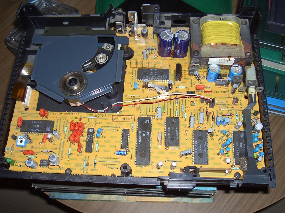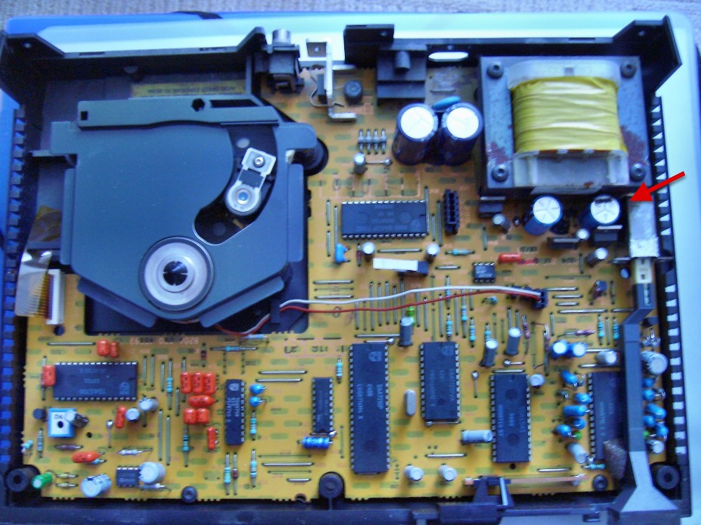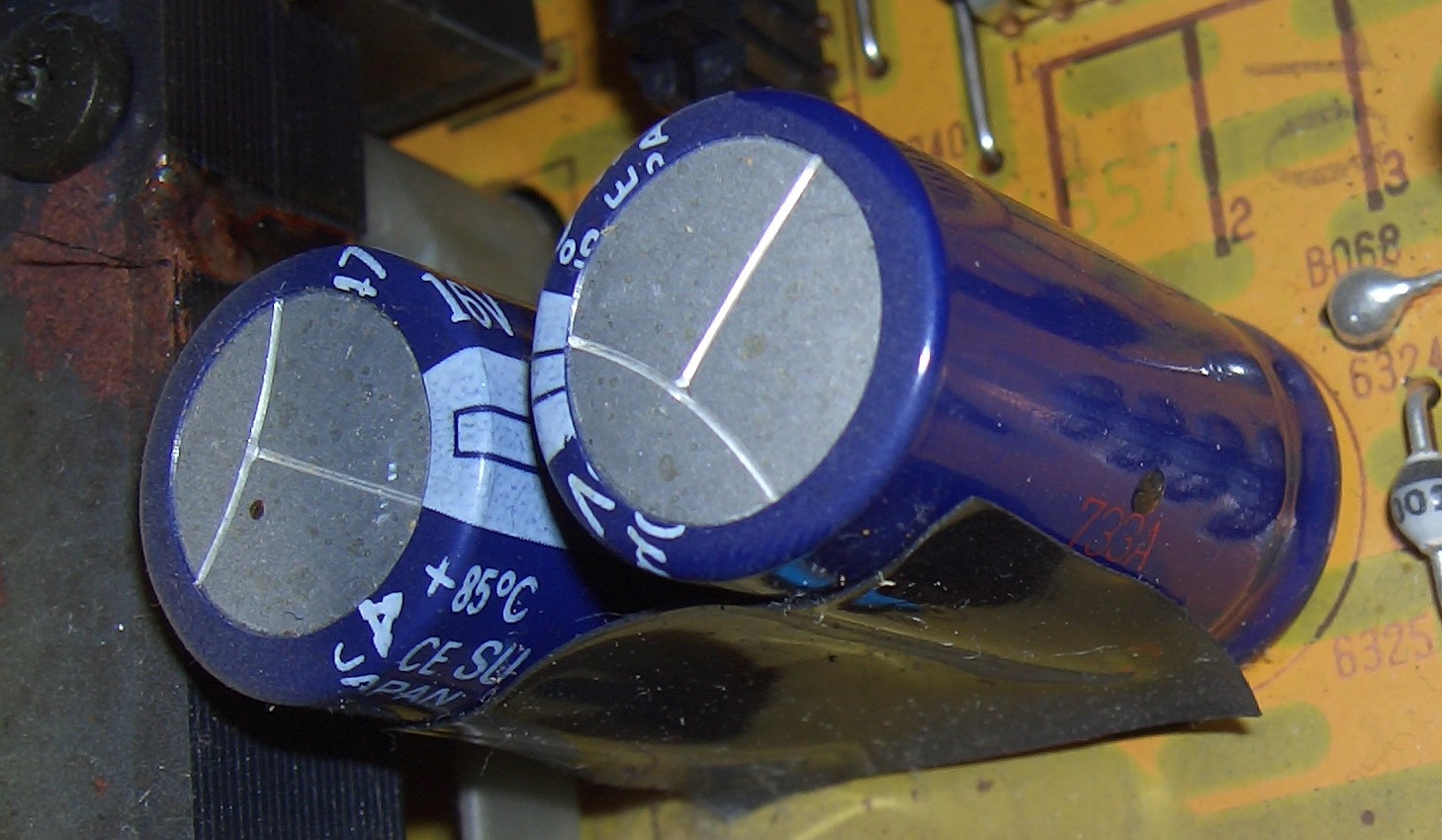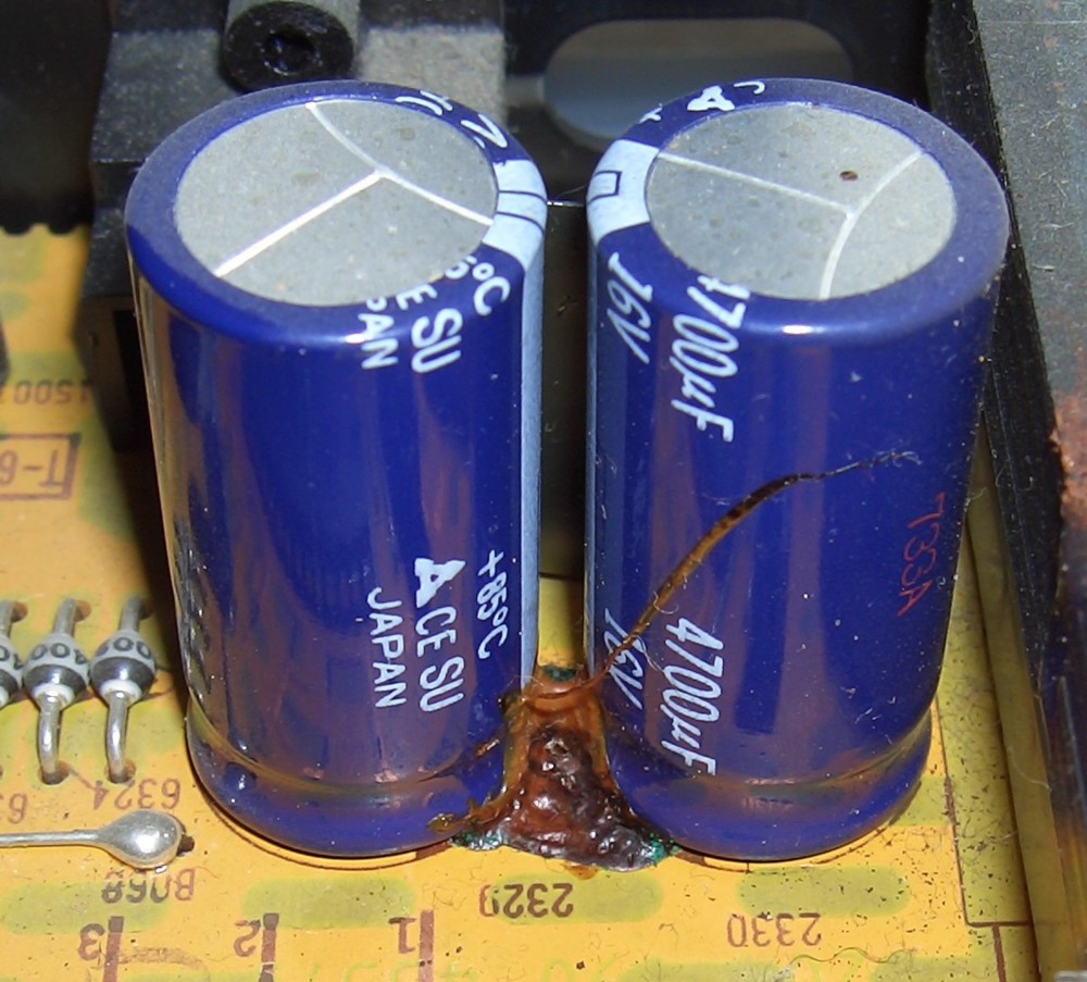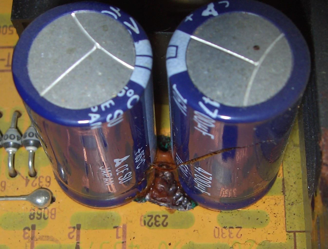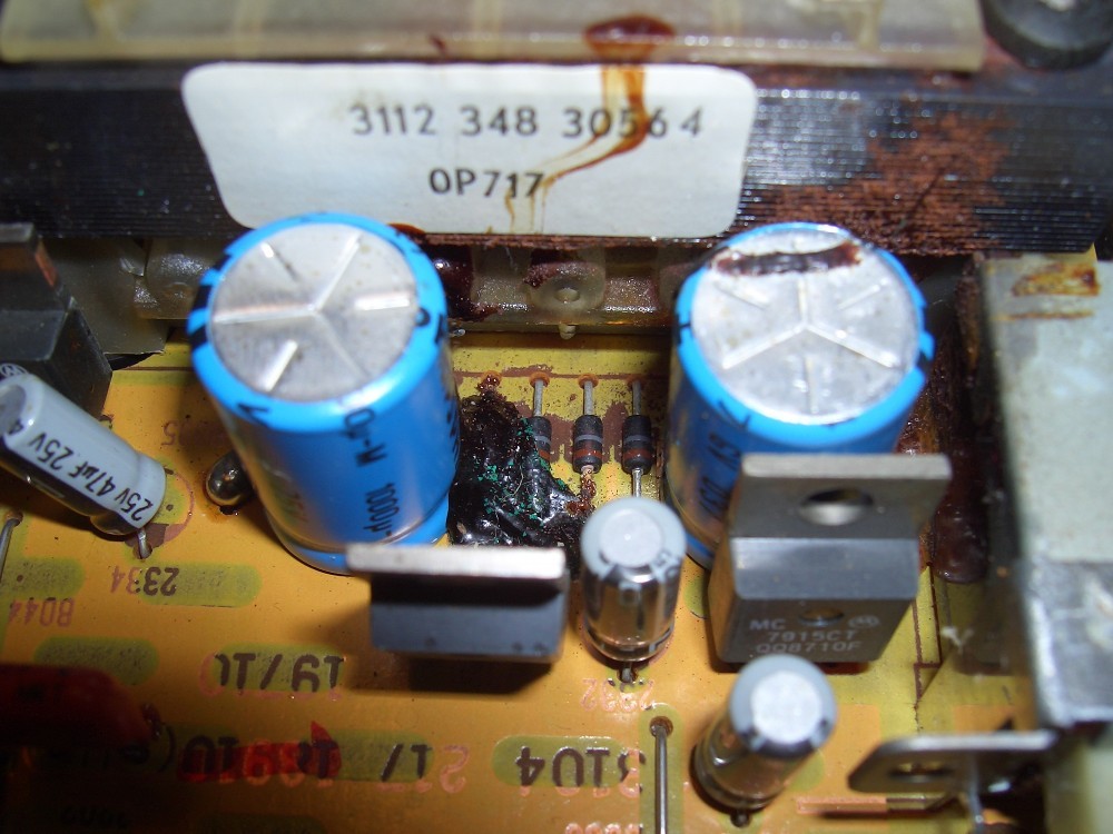 hallo synthifreak, auch das scheint kleber zu sein der viele jahre der umwelt ausgesetzt war, entsprechende feuchtigkeitseinflüsse scheinen dem kleber zugesetzt zu haben. löte die verklebten elkos aus, reinige die leiterplatte von dem kleber prüfe die ausgelöteten elkos auf ihren kapazitätsgehalt und bei überschreitung einer vertretbarer toleranz von ca.- 15% wechsele diese. bei einem trafogespeistem netzteil spielt der esr-wert keine so große rolle mfg harry