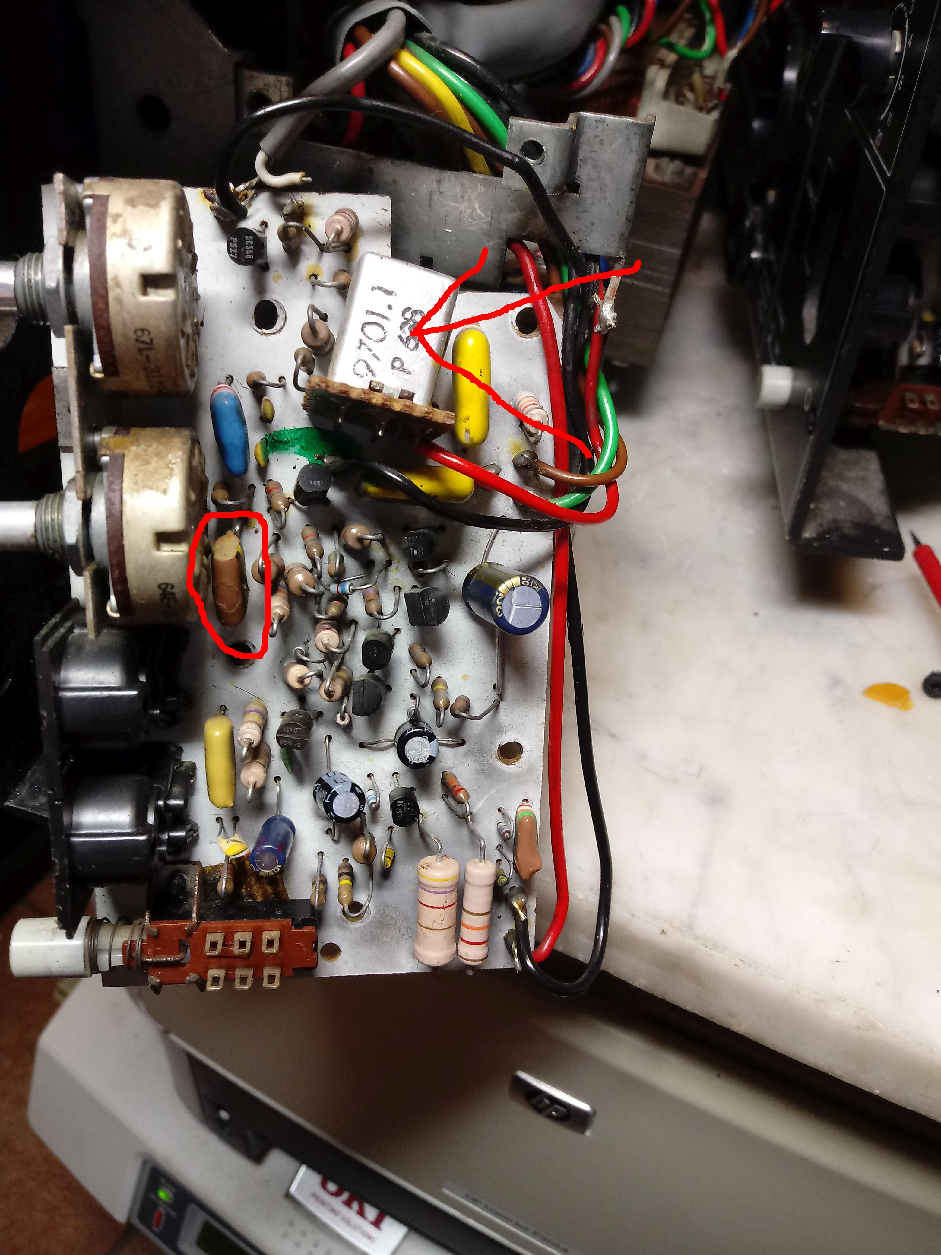 Nun bin ich am Eingang der Lautsprecher. Da stimmen schon ein paar Spannungen an den Transistoren nicht. Weiter hab ich durch Zufall gesehen das ein Kondensator gebrochen ist. Hab das auf dem Bild eingekreist. Diese kleine Platine macht mir etwas Probleme. Sie ist nirgentwo Beschriftet. Ich muß also jedes Bauteil Aufschreiben und dann in den weiteren Plänen suchen und schauen was es für Werte hat. Zudem und für mich Übel scheint meine Platine anders zu sein wie das was im Plan ist. Da sind Bauteile die ich so nicht finde. Ich hab mal Rote Pfeile in die Bilder gemacht. Und dann sind da ja diese bunten Kondensatoren. Da steh ich denn was die Werte betrifft auf dem Schlauch. Bei Wiederständen kann man die Farben so schön eingeben und bekommt angezeigt was es ist, aber für die Kondensatoren hab ich noch nichts finden können. Ich hab sie jetzt mühsam aus den Plänen rausgesucht und denke das es richtig ist.