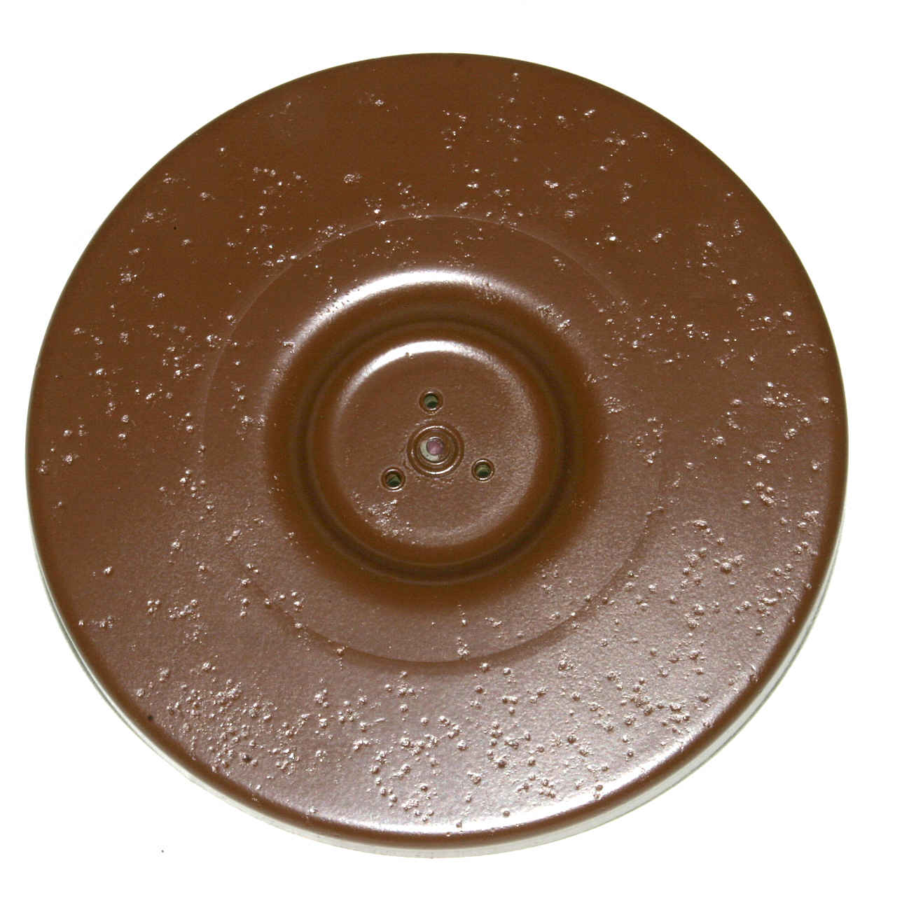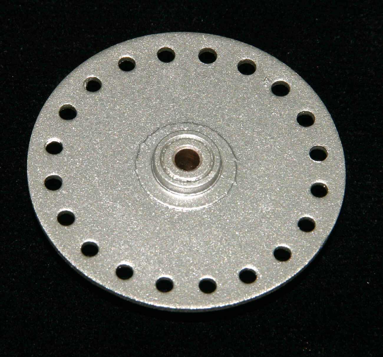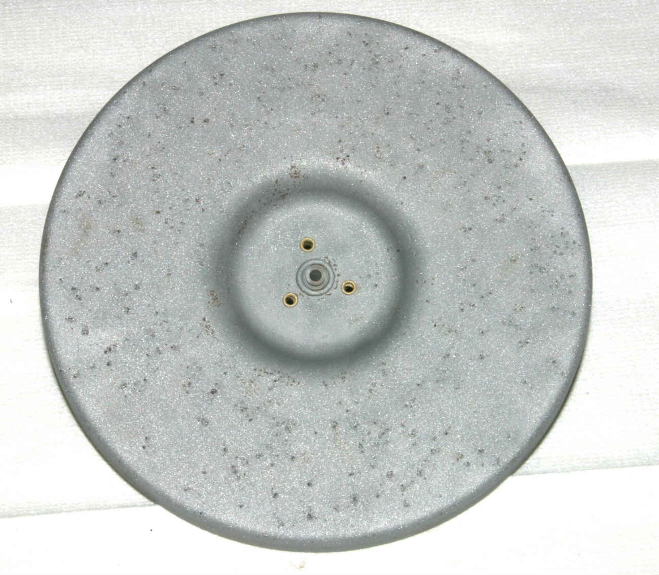 Jetzt kommt der Plattenteller an die Reihe. Es gibt zwei Versionen beim Mignon. Am häufigsten ist der Metallteller, es gab aber auch Versionen aus Kunststoff. Die Teller sind original mit Samtpuder beflockt und unter der Beflockung grundsätzlich total verrostet. Duch die Hohlachse des Plattentellers läuft die Achse für das Heben und Senken des Puks. Häufig ist die Puk-Achse in die Hohlachse eingerostet. Beim Trennen muss man sehr vorsichtig sein, damit da nichts verbogen oder beschädigt wird.