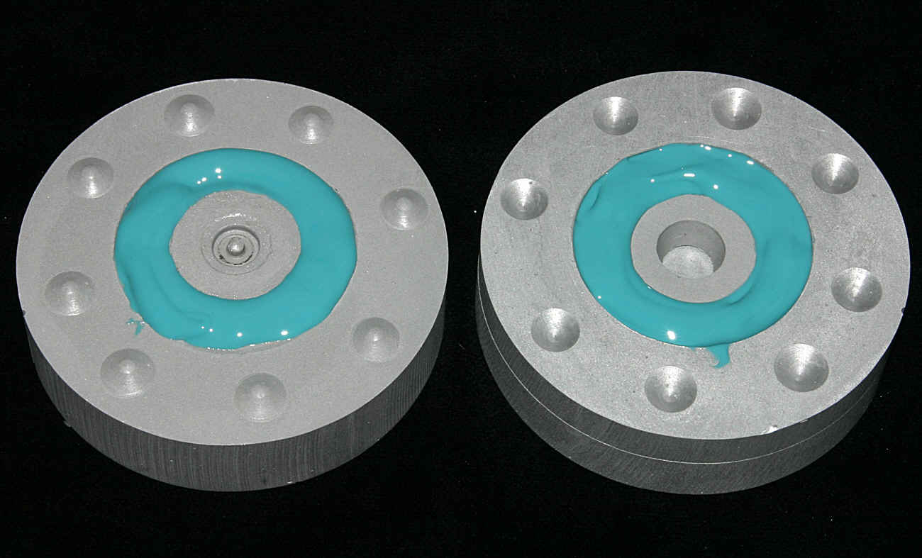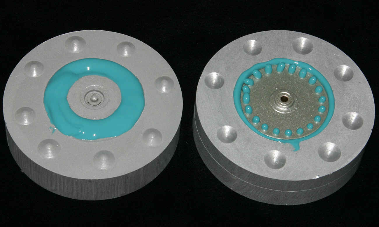 Sitzt das Rad in der Form einwandfrei, wird es wieder entfernt und das Silikon wird in beide Hälften eingefüllt. Dabei sollten möglichst keine Luftblasen entstehen. Dann wird das Metallgerüst wieder eingesetzt und die Form geschlossen und beschwert.