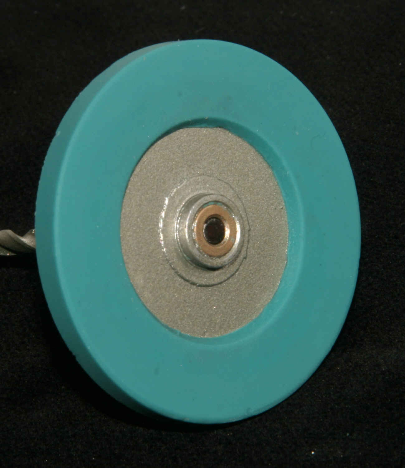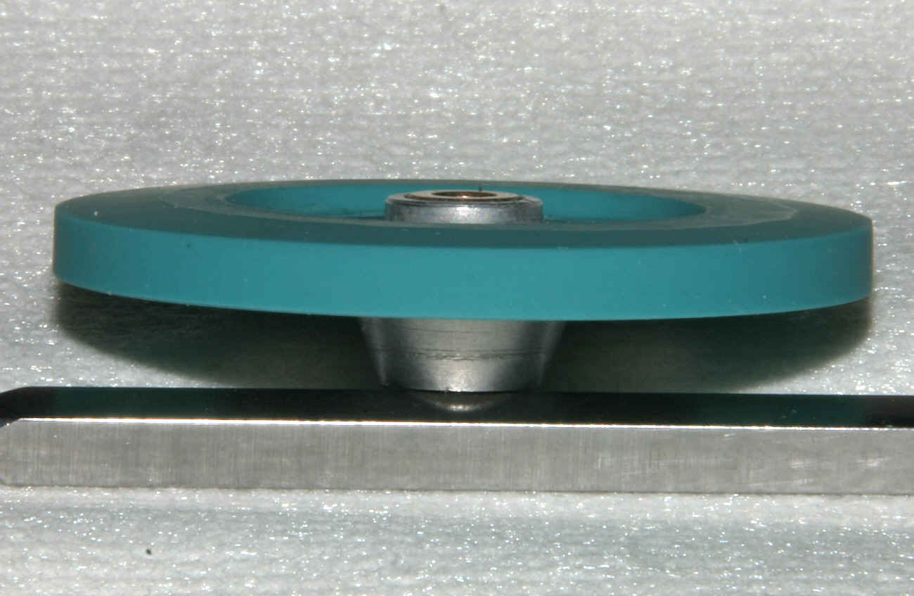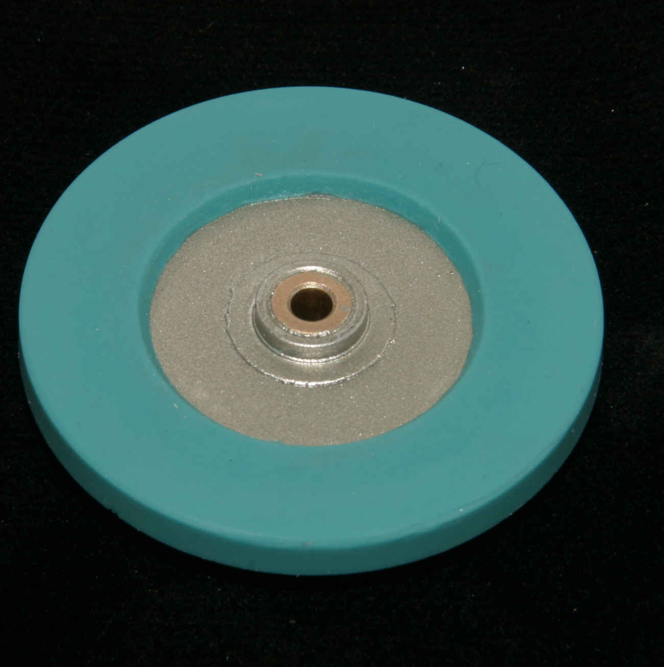 Die unvermeidlichen Pressfahnen werden entfernt und das Reibrad kommt noch mal in die Drehbank um nachgeschliffen zu werden. Denn ein geringfügiger Höhenschlag ist bei dieser indirekten Methode nicht zu vermeiden. Deshalb ist es wichtig, ein Silikon zu verwenden das wenigstens bedingt schelifbar ist. Umfang und Flanken werden nun also nachgeschliffen. Im letzten Bild sind die geschliffenen Flächen gut zu sehen. Dabei handelt es sich zwar um ein anderes Exemplar, aber das ist ja egal. Das Reibrad läuft nun wieder sauber rund und ohne Höhenschlag. Störend ist natürlich die Farbe. Aber ein schwarzes Ssilikon mit den entsprechenden Eigenschaften war einfach nicht aufzutreiben und Einfärben verändert die Eigenschaften derart, dass das ausscheidet.