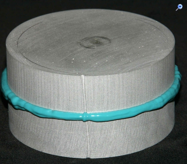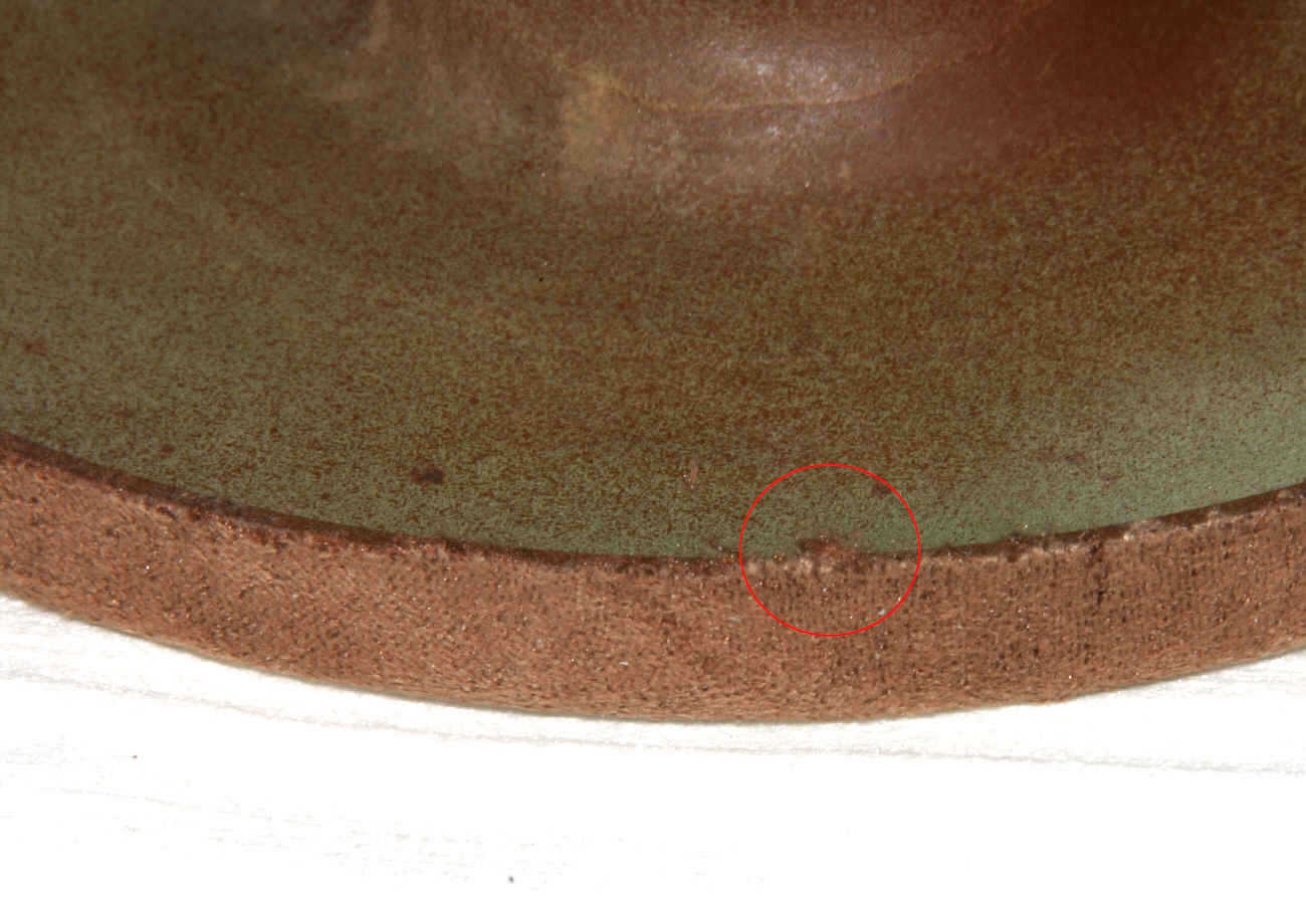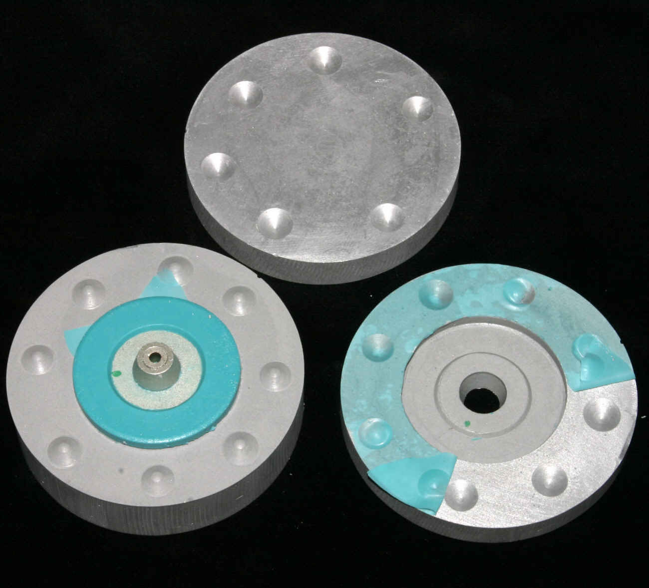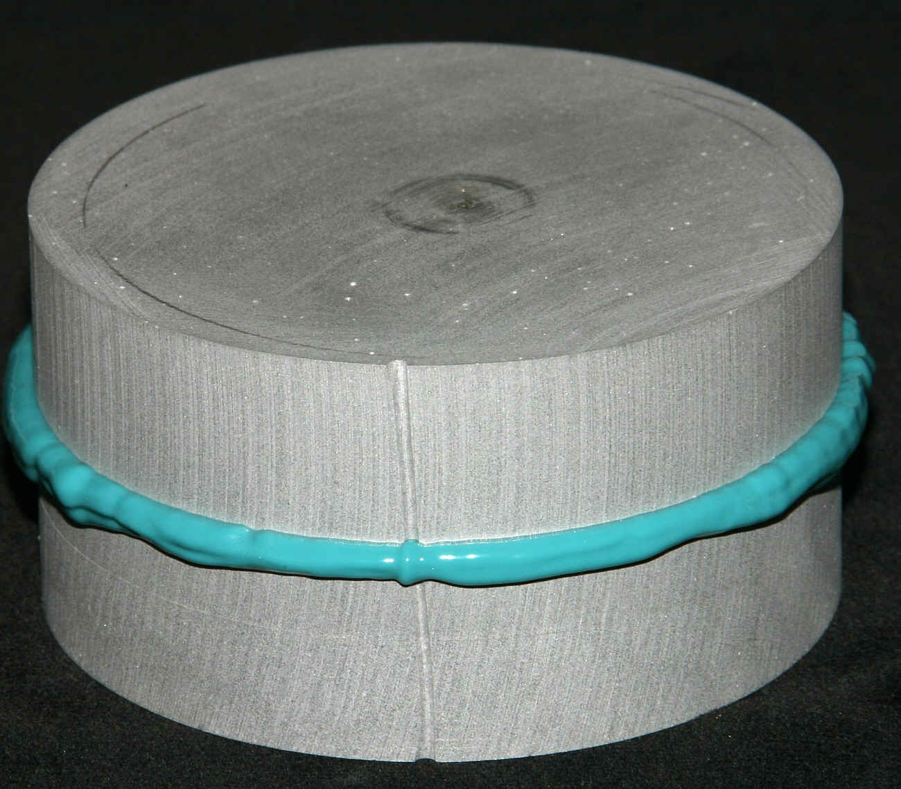 Die unvermeidlichen Pressfahnen werden entfernt und das Reibrad kommt noch mal in die Drehbank um nachgeschliffen zu werden. Denn ein geringfügiger Höhenschlag ist bei dieser indirekten Methode nicht zu vermeiden. Deshalb ist es wichtig, ein Silikon zu verwenden das wenigstens bedingt schelifbar ist. Umfang und Flanken werden nun also nachgeschliffen. Im letzten Bild sind die geschliffenen Flächen gut zu sehen. Dabei handelt es sich zwar um ein anderes Exemplar, aber das ist ja egal. Das Reibrad läuft nun wieder sauber rund und ohne Höhenschlag. Störend ist natürlich die Farbe. Aber ein schwarzes Ssilikon mit den entsprechenden Eigenschaften war einfach nicht aufzutreiben und Einfärben verändert die Eigenschaften derart, dass das ausscheidet.
