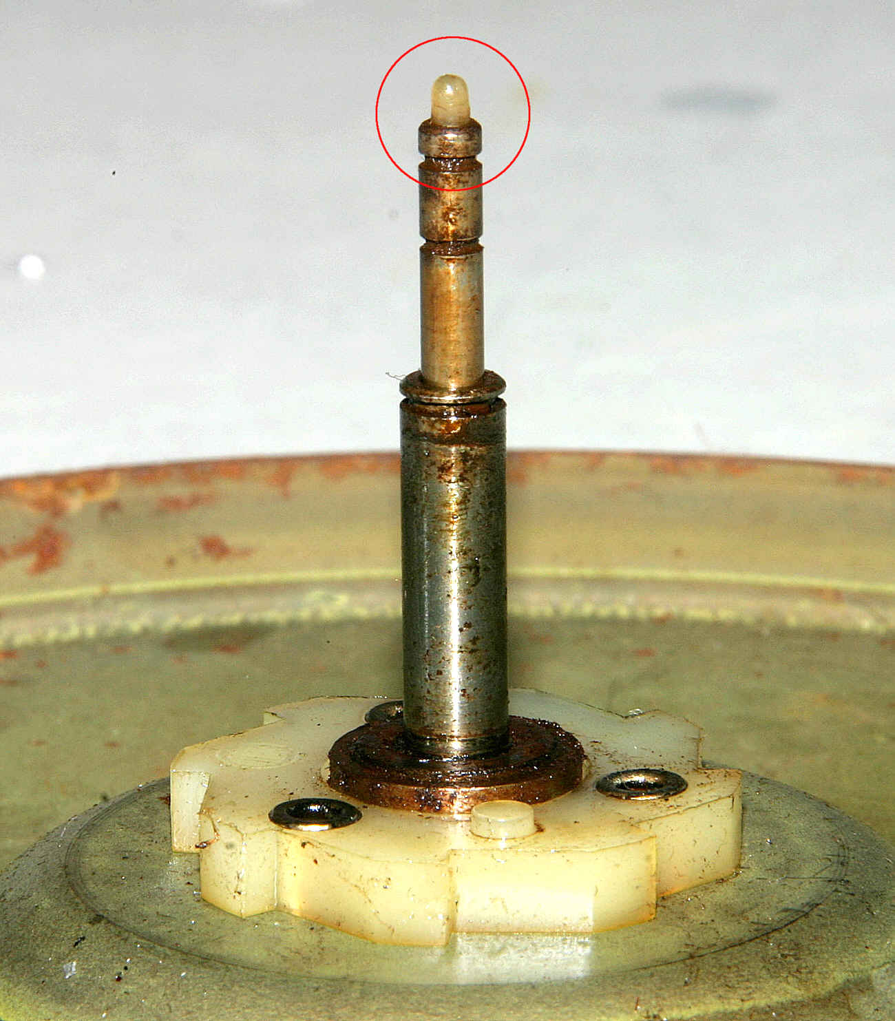Am Ende der Puk-Achse sitzt ein eingeschraubtes, abgerundetes Stück Nylon. Es sitzt auch einer Kontaktfeder auf die beim Abschalten des Mignons den NF-Ausgang kurzschließt. Dieser Nylonstummel dreht sich ständig auf der Kontaktfeder. Bei Mignons mit sehr langer Laufzeit ist dieser Stummel durch Verschleiß abgeflacht und muss dann ersetzt werden. Bei diesem Mignon ist keinerlei Verschleiß feststellbar. Viel kann der nicht gelaufen sein, oder wurde in der Vergangenheit mal gewechselt.