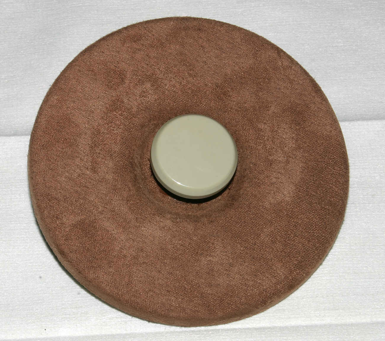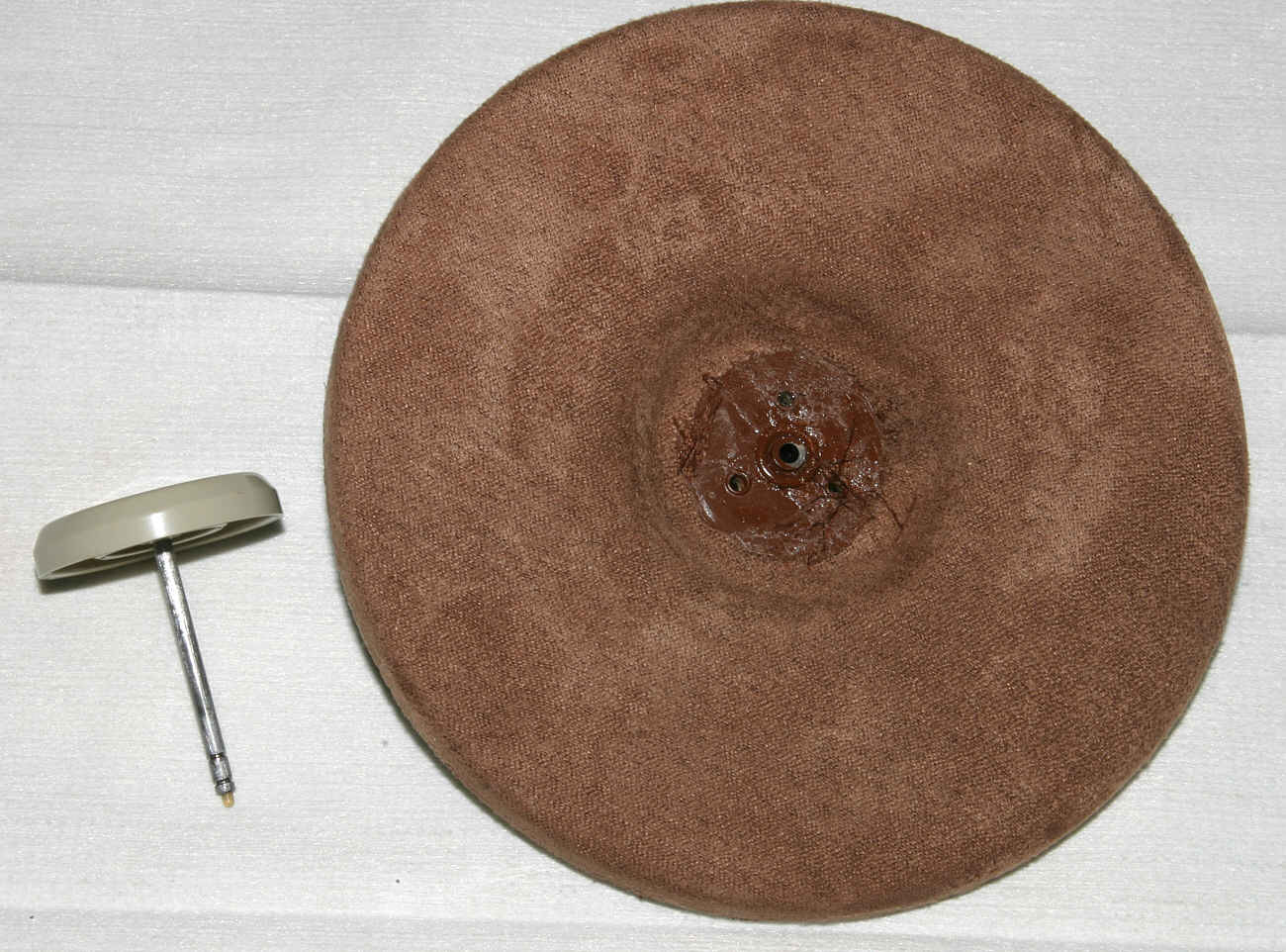 Nun muss ein neuer Bezug drauf. Es gibt Firmen die eine Neubeflockung durchführen. Das kostet ca. 30 Euro. Ist mir etwas zu teuer und ein textiler Bezug tut es auch. Einen passenden Stoff zu finden ist nicht ganz einfach. Er sollte von der Struktur her passen, die richtige Farbe haben, darf nicht zu dick sein (sonst sitzt der Puk später zu hoch) und sollte eine gewisse Elastizität haben, da er ja um die Rundungen des Tellers faltenfrei herumgezogen werden muss. Ich bin bei einem Deko-Kissen fündig geworden, das für diese Zwecke geschlachtet wurde. Zum Verkleben hab ich Kontaktklener aus der Sprühdose verwendet. Abraten muss man vom Pattex Sprühkleber. Dessen Sprühkopf ist eine unmögliche Fehlkonstruktion. Viel besser ist der Sprühkopf von "Uhu permanent".