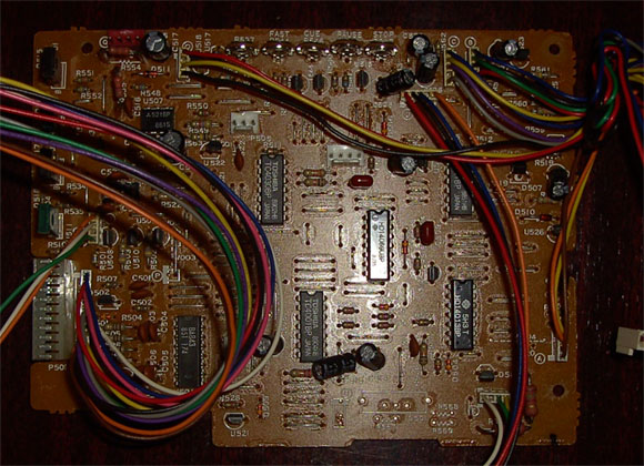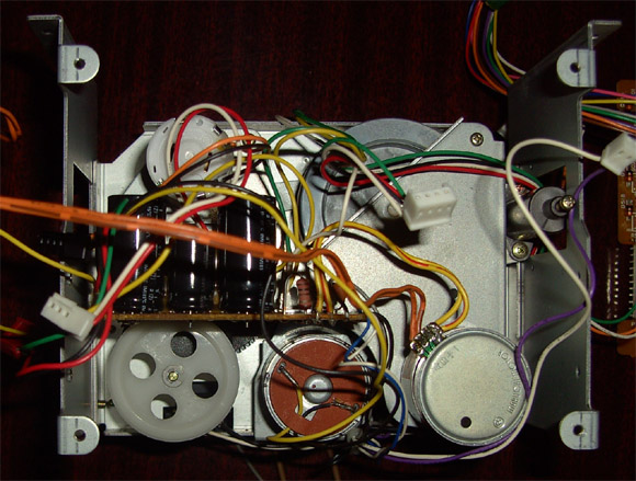 habe erstmal alles zerlegt. Das erste Bild ist die Ansicht von hinten. Der Motor links oben bewegt den Kopfträger und die Andruckrolle. In der Mitte der Wickelmotor und rechts der Tonmotor. Das zweite Bild ist die Ansicht von unten. Das letzte Bild zeigt die Leiterplatte die hinten am Laufwerk war. Auf Bild 1 sind die Kondensatoren auf der grünen Platine, allererstes Bild, zu sehen. 2 Leitungen des Tonmotors gehen dahin. 2 weitere Leitungen gehen zur großen Leiterplatte (letztes Bild). Wickelmotor und Motor für den Kopfträger haben jeweils 2 Anschlüsse, die ebenfalls mit dieser Leiterplatte verbunden sind. An welche der 4 Anschlüsse des Tonmotors soll das Ohmmeter angeschlossen werden? Leider läßt man mir hier nicht immer die Zeit, die ich brauche. Es wird sich also noch länger hinziehen.