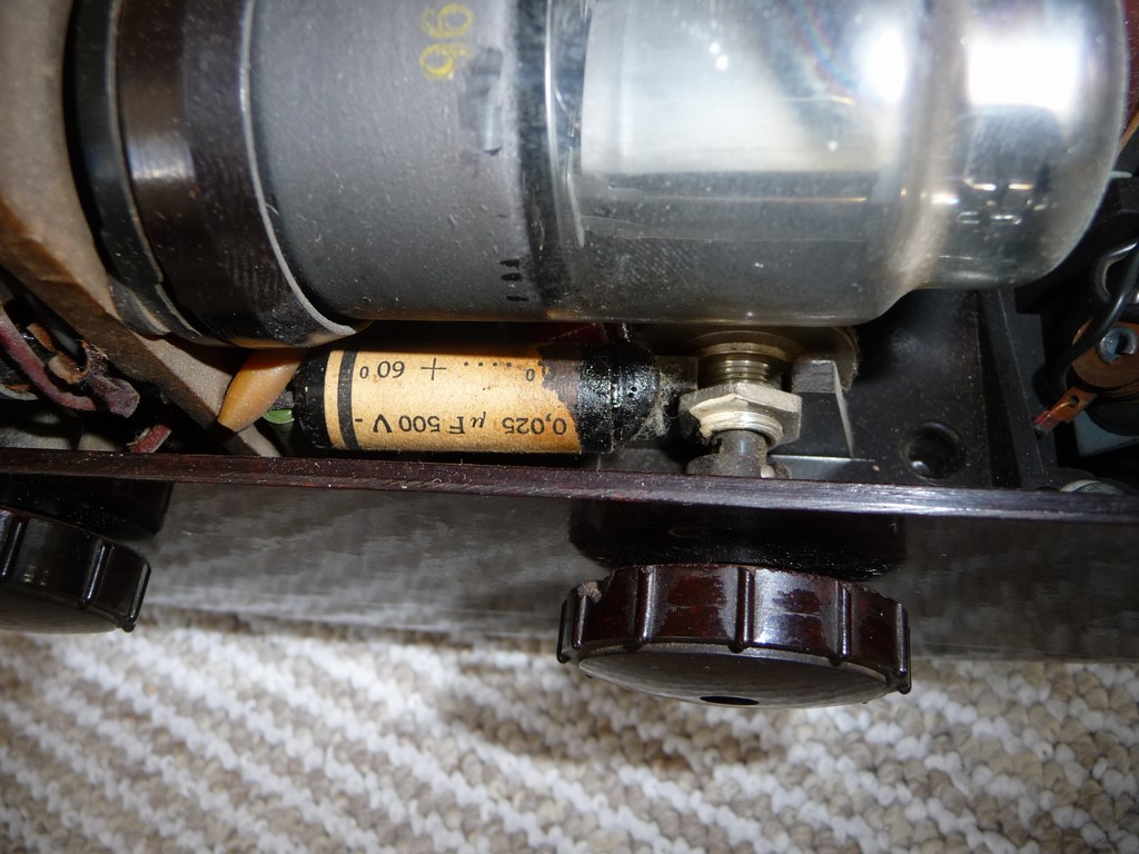Innen sieht er recht sauber und unverbastelt aus, ich konnte nur ein getauschtes Teil finden. Sogar ein zusammengefalteter Schaltplan steckte drin. Die Röhrenbestückung ist 2x UCH 81, UF 85 und UEL 51. Schöne Mischung, er gefällt mir immer besser...