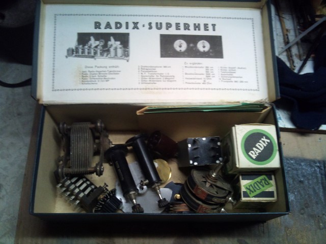 Aus den von Dir fotografierten Einzelteilen der Firma Radix läßt sich kein Empfänger aufbauen. Diese Teile gehörten zu einem Empfängerbausatz, der etwa zwischen 1927 und 1930 angeboten wurde. Es läßt sich an Hand der Bauelemente aber keine konkrete Schaltung ableiten. Das Bild 8516 zeigt einen Trimmkondensator (20 cm), der zur Neutralisation einer Verstärkerstufe diente. Das letzte Bild fällt völlig aus dem Rahmen. Es zeigt eine Steckdose für UKW zum Anschluß einer symmetrischen UKW- Antenne und einen Anschluß für eine Antenne K, M und L mittels eines Bananensteckers, etwa 1950.