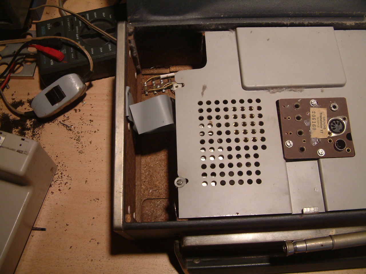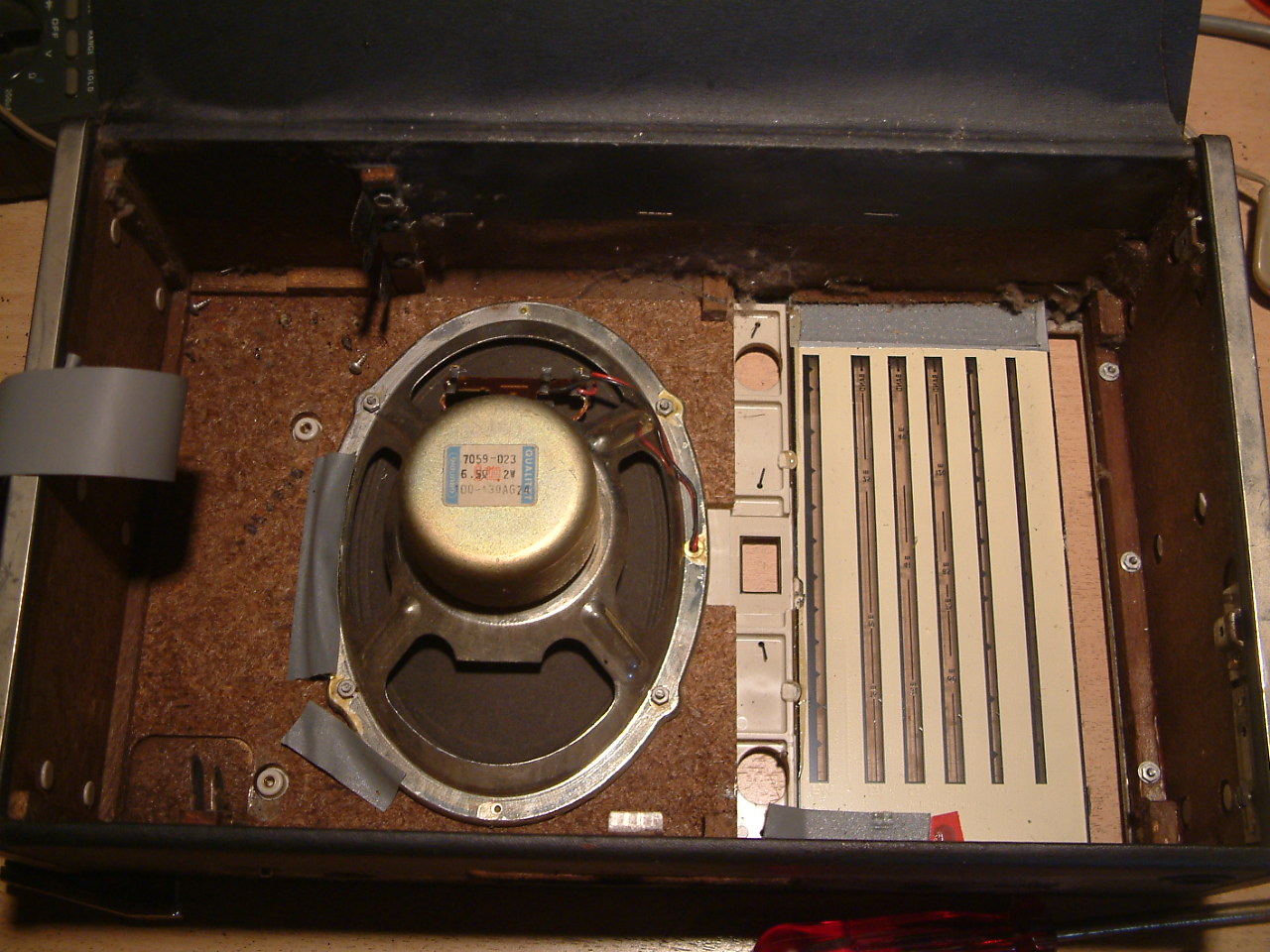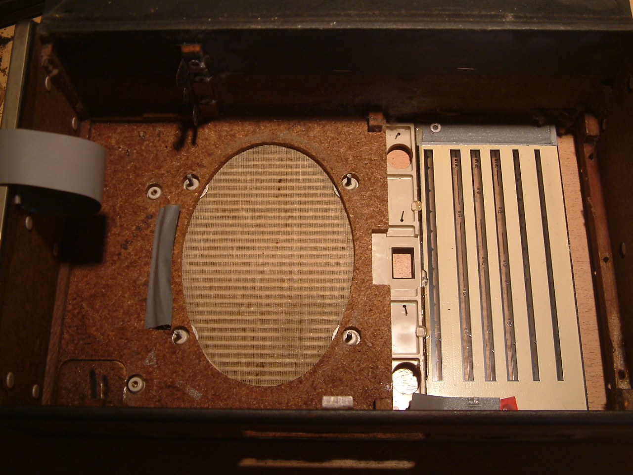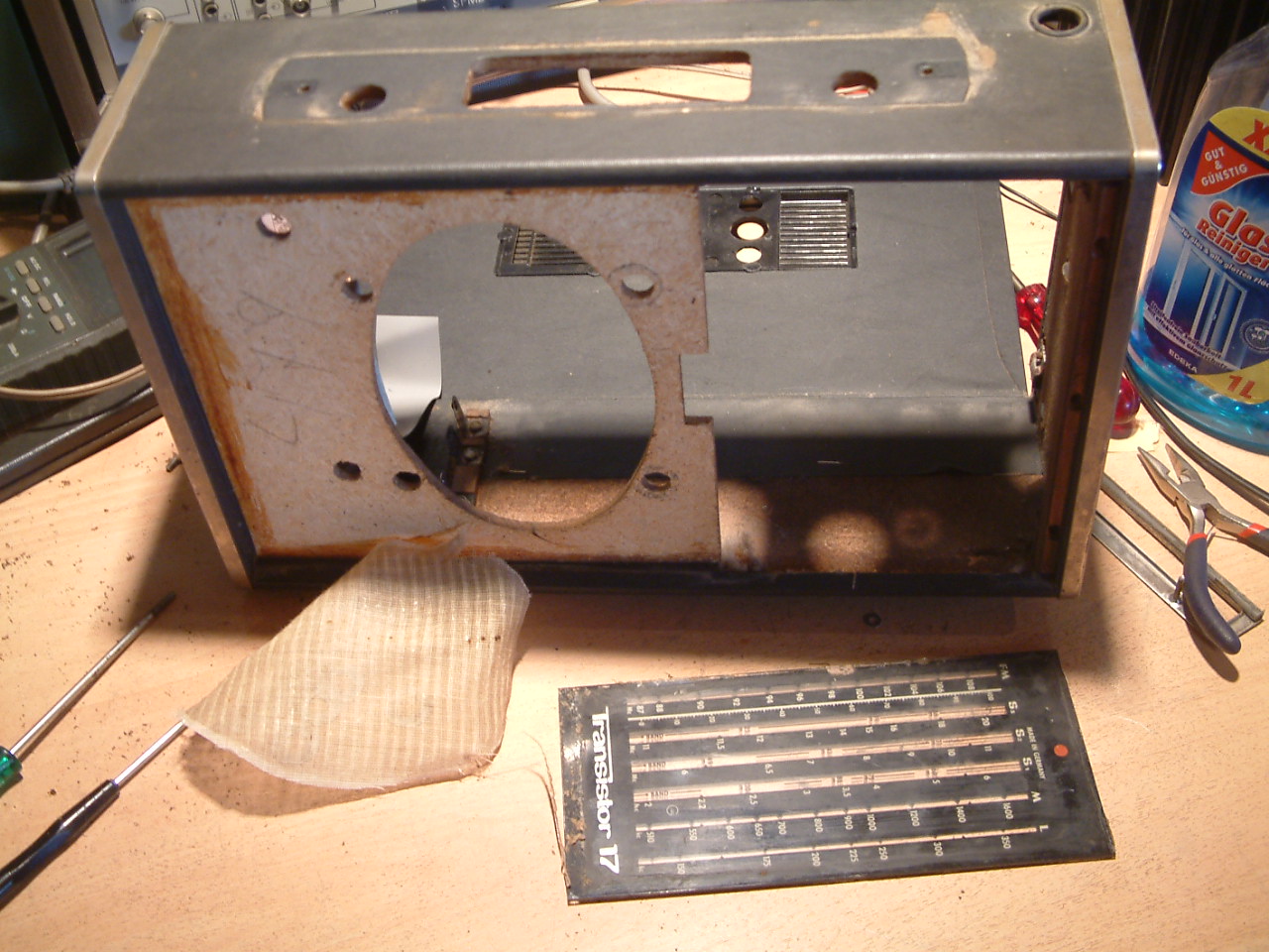 Der Lautsprechergrill, der nach vorn entnommen wird, ist mit einer Art von Phenolharzpampe mit dem Skalenscheibchen welches nach hinten entnommen werden muß, verklebt. Es bleibt kein anderer Weg als diese Verbindung sorgfältig und behutsam zu lösen. Das klebezeug zieht sich wie Kaugummi dabei, wenn es lang genug gezogen ist kann man es mit dem Teppichmesser durchschneiden...
