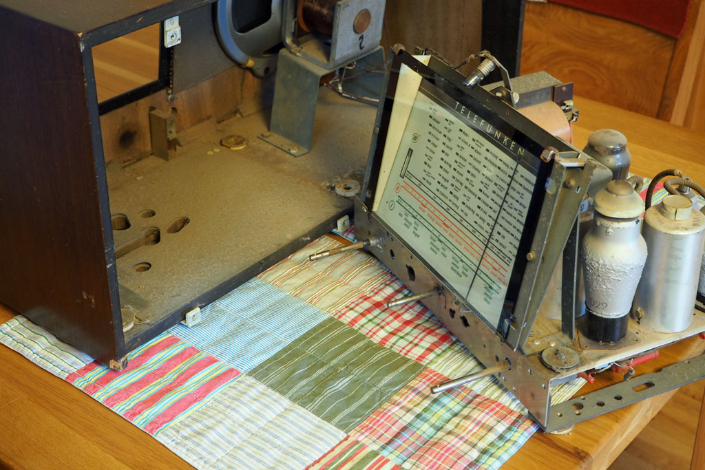 Schondorfer:Martin, guten Abend, danke und ich hoffe ich störe nicht beim Tatort :-) Seitenteilchen...ja, die sind aus Blech, fest an der Skala und mit der gleichen Farbe gespritzt - die meinst Du - oder? Die sorgen für den Abstand von der Blechskala zum Glas...unten näher als oben, also Glas steht steiler als Skala, die beiden sind nicht parallel. Soweit, so gut. Nun geht es um den Abstand vom Glas zum Gehäuse(rahmen). Im Holzgehäuse ist ein großer Rahmen (schwarzes Bakelit??) für Lautsprecher und Anzeige. Der Lautsprecherstoff/Schallwand liegt mit allen 4 Seiten bündig am Rahmen - kein "Luftspalt", klaro. Bei mir, das Glas: es steht steiler als die Blechskala (eben durch den Verlauf der Seitenteile an der Skala). Aber der Rahmen steht noch steiler. d. h. das Glas liegt unten am Bakelit an...und oben steht steht der Rahmen fast 1 cm vom Glas ab. D. h. es ist oben Luft zwischen Gehäuse(rahmen) und Glas. Das soll doch nicht sein? Soll nicht das Glas ringsum am Bakelitrahmen anliegen? Wahrscheinlich hab ich zu zeitig gepostet, alles ist zerlegt, sorry. Morgen bau ich alles zusammen und bringe Fotos.