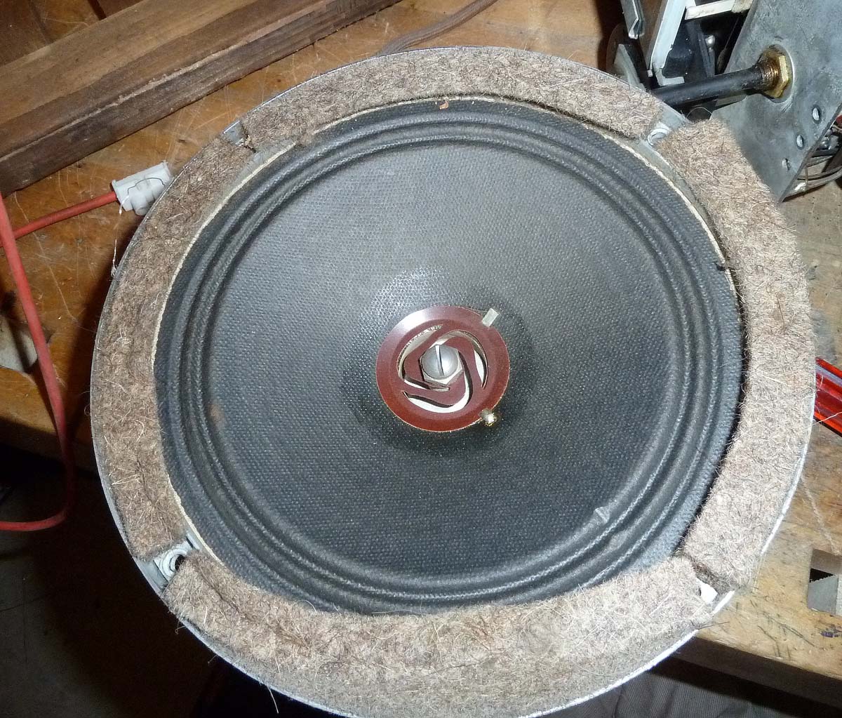 Das Chassis ist mit 9kg auffallend schwer, dazu kommt noch der dynamische, elektrisch erregte Lautsprecher mit angebautem Ausgangstrafo, der nochmals etwa 2kg auf die Waage bringt. Die Zentrierung der Membrane ist hier interessant gelöst: