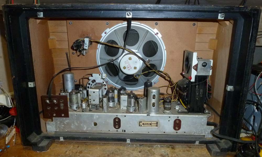 mir ist dieses Philips-Radio zugelaufen und will mir einfach seinen Namen nicht nennen. Auf dem Typenschild fehlt netterweise die Typenangabe oder dann ist sie spurlos verschwunden. Das Gerät wurde in der Schweiz in den 50er-Jahren verkauft und hat LW, MW, KW und UKW sowie einen Plattenspielereingang. Es hat keine Ferritantenne. Die Beschriftungen auf der Skala sind alle französisch, auch die Sendernamen. Bestückt ist es wie folgt (Reihenfolge dem vermuteten Signalpfad entlang): EF42, ECH42, EF43, EAF42, EB91, EBC41, EL41, AZ1, EM34. Diese Bestückung deutet auf eine kreative, unkonventionelle Lösung für UKW und auf Grund der Filteranordnungen auf 2 AM/FM-ZF-Stufen. FM-Demodulation dürfte ein Ratiodetektor mit der EB91 sein. So wie das Chassis aussieht, war da in früheren Versionen ebenfalls eine Rimlock-Röhre, aber hier ist die EB91 original, so steht es auch auf der Rückwand. Auffallend sind die sehr kleinen ZF-Filter, zudem sind die AM- und FM-Filter in separaten Schirmhauben.
