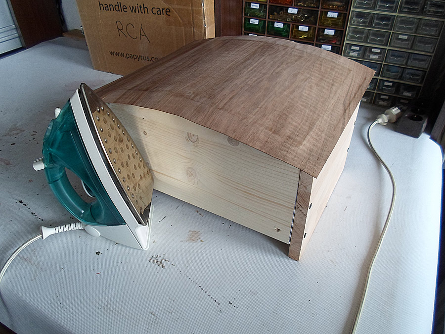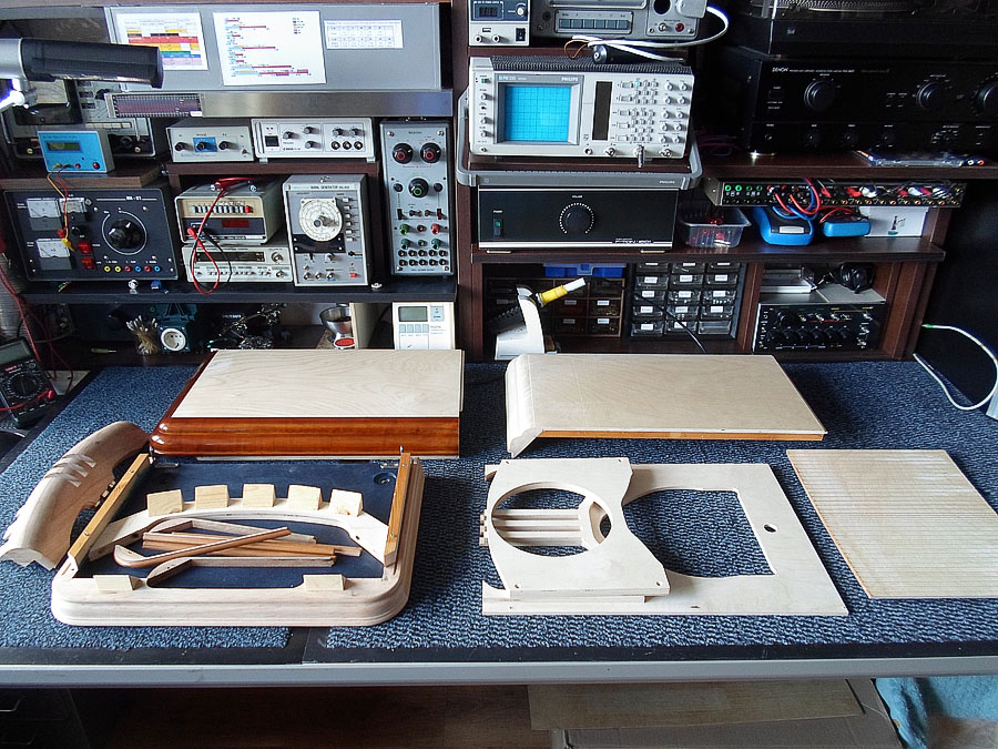 Wie schon erwähnt, die Arbeit mit dem Gehäuse lief parallel. Die Bauteile habe ich in Petersburg bestellt und als die kamen habe ich angefangen. Erst mal mit Furnier.