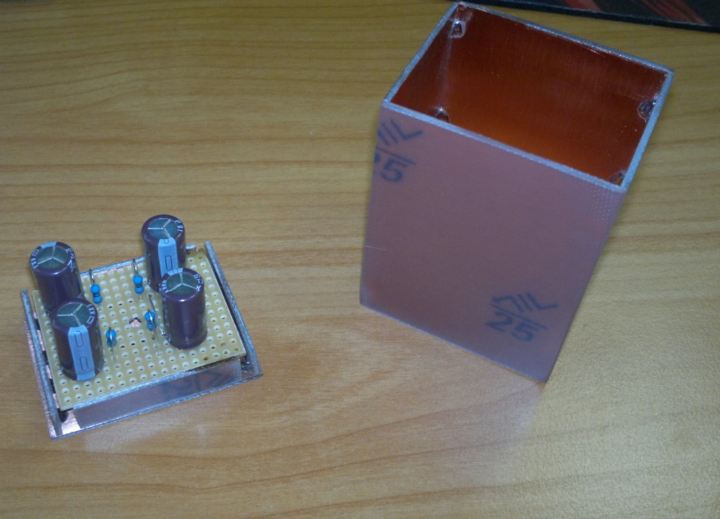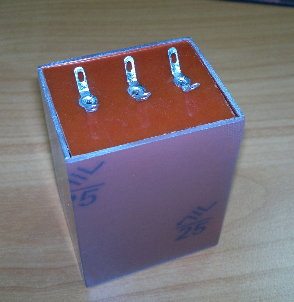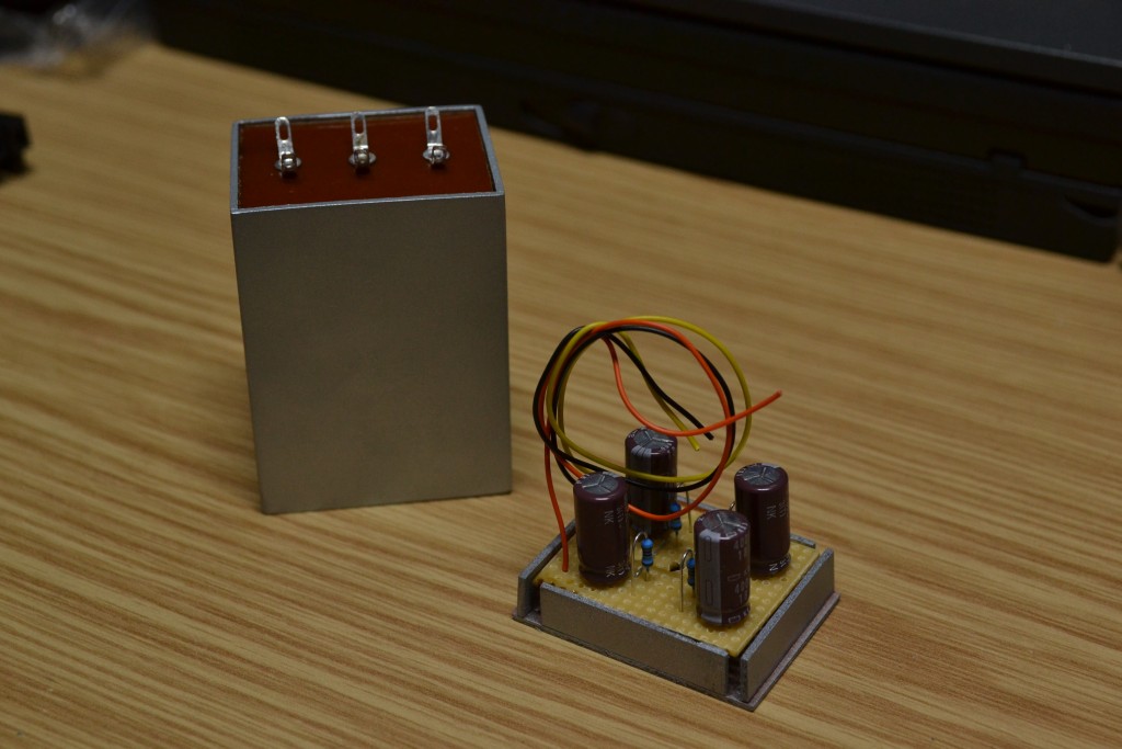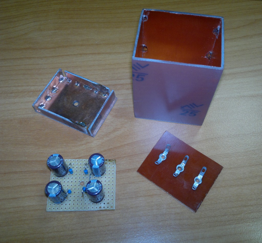 Es gibt Neuigkeiten bezüglich des fraglichen Doppelelkos. Da sich ja nun keinerlei Bilddokumente des Originalzustands auftreiben ließen, habe ich improvisiert: Einer der Anschlußdrähte ist noch original erhalten. Anhand dessen länge läßt sich die Höhe des Kondensatorbechers abschätzen. Die Abmessungen der Grundfläche waren ja durch Abdrücke auf dem Chassis einwandfrei erkennbar. Der Kondensator-Nachbau konnte also beginnen. Da kurz nach dem Einschalten, wenn die AL1 noch nicht ganz auf Betriebstemperatur ist, Spannungen von über 500V am Ladekondensator auftreten können, schien mit die Verwendung der üblichen 450V-Elkos etwas knapp. Ich habe mich daher für eine Reihenschaltung von je zwei 18µ/400V-Elkos entschieden, welche über je 2 parallel geschaltete 1M-Winderstände symmetriert werden. Als Gehäusematerial kommt einseitig kupferbeschichtetes FR4 zum Einsatz, welches sich ganz vorzüglich zu einem entsprechenden Becher verlöten läßt. Die Oberseite wird durch ein mit entsprechenden Nietösen versehenes Stück Pertinax gebildet, analog zu dem unter dem Chassis verbauten Sammelkondensator.