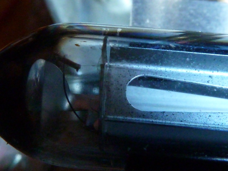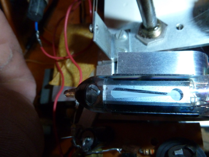 Ich habe mir mal die DM70 noch etwas genauer angesehen. Der Aufbau ist ähnlich wie der einer Fluoreszenz-Anzeige und damit völlig anders als bei den EM84 oder auch den 'magischen Augen'. Die Kathode ist hier nämlich vorne und damit (theoretisch) sichtbar, da der direkt geheizte Faden aber sehr dünn ist, sieht man sie im Betrieb nicht. Hier das Bild: Am Ende des gebogenen Drahts, der als Spannfeder dient, geht der Faden durch eine Kerbe in der Glimmerscheibe zur Unterseite der Röhre. Hier noch das ganze Bild: Die Anode mit der Leuchtschicht ist hier ganz 'unten' hinter dem Blech mit dem ausgeschnittenen 'Ausrufezeichen', das als Steuer-'Gitter' dient. Ganz vorne sieht man stellenweise den sehr dünnen Kathodenfaden. Ohne Steuerspannung kommen die Elektronen ungehindert zur Anode, so dass das ganze 'Ausrufezeichen' leuchtet. Mit einer (negativen) Steuerspannung werden die Elektronen vom Blechrand her verdrängt, so dass je nach Spannungshöhe ein mehr oder weniger langes Stück vom dünnen Teil des 'Ausrufezeichens' dunkel bleibt und der restliche Teil vom Strich wird dünner, ebenso der Punkt des Ausrufezeichens. Bei genügend grosser Steuerspannung bleibt das Ausrufezeichen komplett dunkel. Somit ist die Anzeige genau umgekehrt zur EM84, die bei hoher Steuerspannung hell ist. Da die Röhre hier über einen Vorwiderstand mit Wechselspannung geheizt wird, wurde noch ein RC-Filter eingebaut, damit vom Steuergitter keine Brummspannung in die Regelspannung kommt.