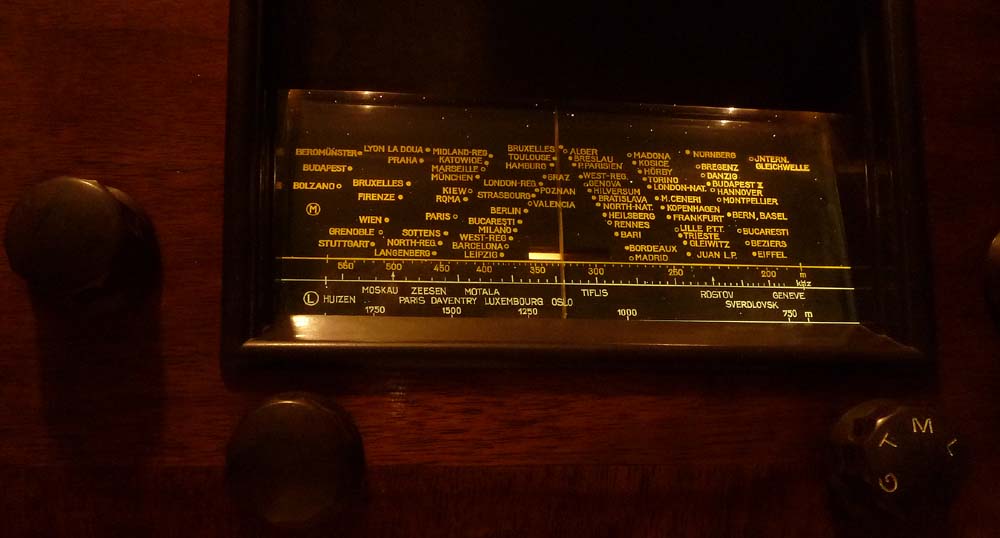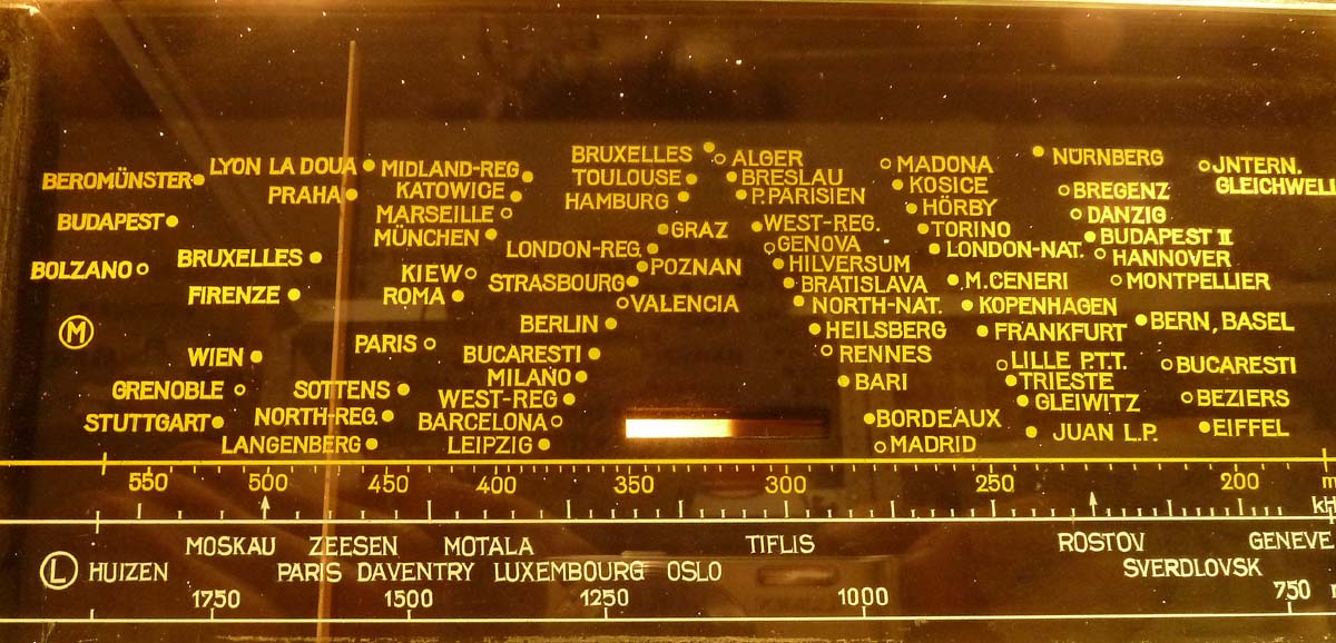 Bei der Abstimmskala ist mir noch aufgefallen, dass diese für Röhrengeräte verkehrt herum geht, also die niedrigen Frequenzen wie bei neueren Transistorgeräten links sind. Die Art der Beleuchtung gefällt mir sehr. Hier wurde eine recht dicke Glasplatte verwendet, welche von der oberen Schnittfläche her beleuchtet wird. So bleibt das Licht auf den klaren Stellen unsichtbar, bringt aber die auf der Rückseite aufgedruckte Schrift zum Leuchten (siehe Bild in früherem Beitrag). Die Ausleuchtung ist dabei sehr gleichmässig.
