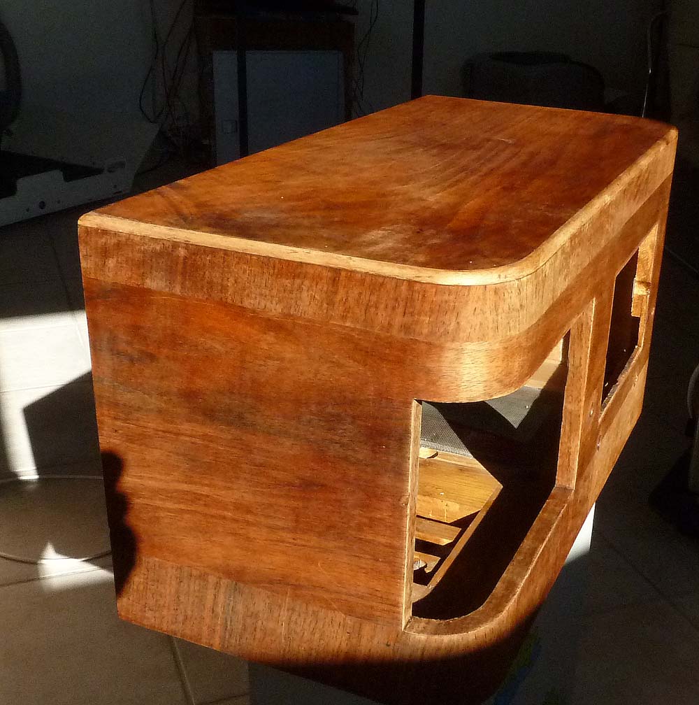 nach kritischer Begutachtung im Sonnenschein und ein paar vorsichtigen Versuchen habe ich das Gehäuse frisch gebaizt, so sind die Farbunterschiede weg, und die angeschliffenen und geflickten Stellen fallen nicht mehr auf. Nun muss nur noch lackiert werden.