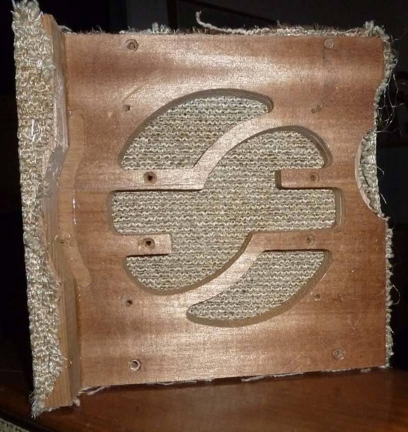 Hier noch die Schallwand von der Rückseite: Da wurde eine kunstvolle Struktur ausgefräst, damit einerseits für die Befestigung der Zierleisten Schraubenlöcher möglich waren, andererseits aber auch für den Schall noch ausreichend Durchlass war. Nicht gerade preisoptimiertes Design, aber auch all die übrigen Rundungen verursachten Zusatzkosten. Damals war Design den Kunden offenbar noch etwas wert, auch die Konkurrenz baute ja meistens eher aufwendige Gehäuse, Bakelitgehäuse waren ja nicht sehr verbreitet, wenn man vom Volksempfänger mal absieht.