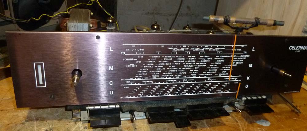 Das Chassis noch mit abgenommenem Skalenblech, das musste weg, damit ich den verharzten Ferritantennen-Antrieb reinigen konnte.
