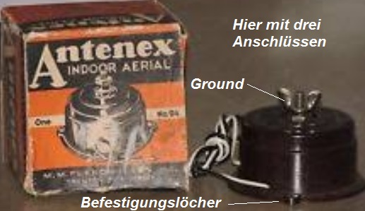 schön das Du Dich noch zugeschaltet hast. Wenn man die wenigen Bilder im Netz anschaut sieht man das diese alten Anten(n)ex- Zimmerantennen auf die Rückwand oder hölzernen Chassisteile aufgeschraubt werden. Also Autodach und kurzer Antennenstab sind hier auszuschließen. Das gilt eher für die modernen Varianten, welche man unter dem Begriff sehr häufig findet. Dieses Bild zeigt die Originalverpackung.....Antenex mit Flügelmutter.