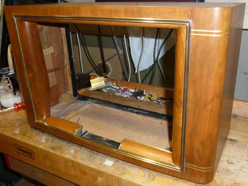 Mit dem Gehäuse geht es weiter. Die Messing-Zierleisten sind poliert und glänzen wieder wie neu und die goldenen Zierstreifen sind wieder aufgemalt. Die erste Lackschicht ist am Trocknen, nach 2..3 weiteren Schichten ist das Gehäuse dann für den Zusammenbau bereit. Da die Zierleisten fesgeklebt sind, konnte ich sie für die Holzbearbeitung nicht entfernen, was die Sache nicht gerade vereinfacht hatte. Da sie so aber zwangsweise lackiert werden, können sie nicht mehr oxidieren und glänzen auch nach 100 Jahren noch