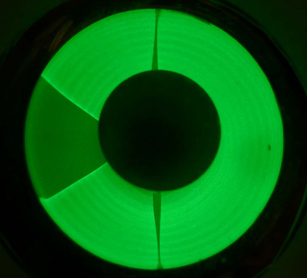 Mit der originalen Spannung von 240V blendet es schon fast, daher habe ich die Spannung mal mit einem Vorwiderstand auf etwa 200V heruntergeholt, so ist es immer noch mehr als genug hell, eventuell reduziere ich die Spannung noch weiter. Bei hoher Aussteuerung wird der Schattenwinkel 'negativ', das heisst, die beiden Leuchtflächen überlagern sich und dort, wo sonst der Schatten ist, gibt es einen hellen Winkel, so ähnlich wie bei der EM87 (und gewissen EM84), wenn sich die beiden Leuchtbänder überlappen. Nochmals besten Dank an Walter für die Röhre.