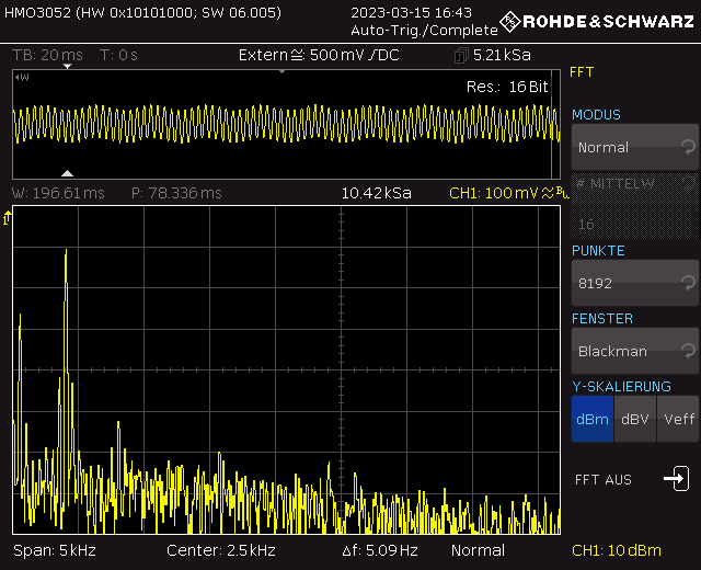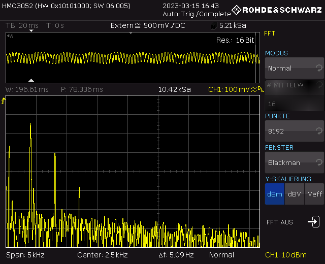 Betrieb als Synchrondemodulator: Die erste Oberwelle ist 40dB gedämpft (also 1% Klirr) und die zweite ist nicht mehr sichtbar. Die 'Seitenbänder' sind Netzbrumm von der Brummschleife aus Signalgenerator und Oszi.