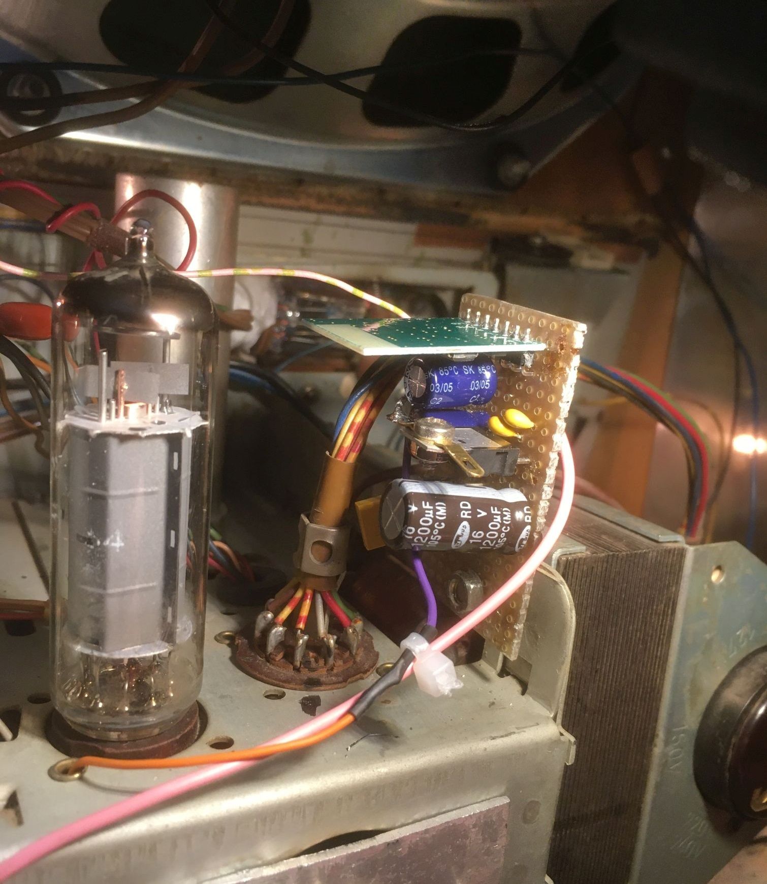 Du schreibst, dein Schaltbild sei kaum lesbar. Nun, bei rm.org fehlt es ganz. Wichtig ist, wie die Röhrenheizungen verdrahtet sind, seriell, parallel und ob an jedem Sockel die Heizung (wie bei mir) einseitig auf Masse liegt. Dann kann man nämlich keine Graetzbrücke nehmen und muss eine Einweggleichrichtung machen. Das von mir verwendete Modul zieht im Leerlauf 35mA. Wahrscheinlich verringert der NF-Trafo bei dir auch die NF-Qualität?