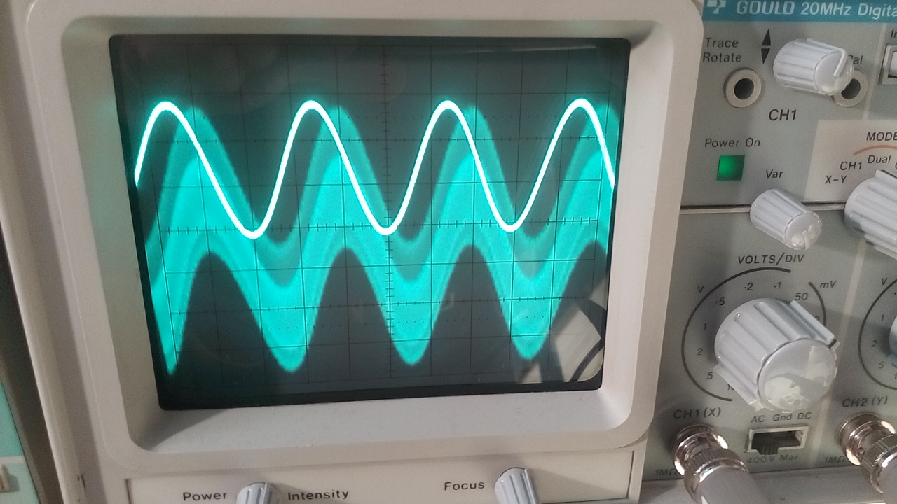 Oben das 17 kHz Signal auf der Sekundärseite des Übertragers. Unten was an der Primärwicklung anliegt. Der Sinus stammt von der Android-App "Frequenzgenerator". Die App funktioniert auch zusammen mit Bluetooth. Empfindlichkeit der beiden Eingänge des Oszis: 50 mV/Div. Die beiden Wicklungen des Übertragers haben jeweils einen Gleichstromwiderstand von 200 Ohm. Ich nehme an es ist ein 600 Ohm Übertrager.