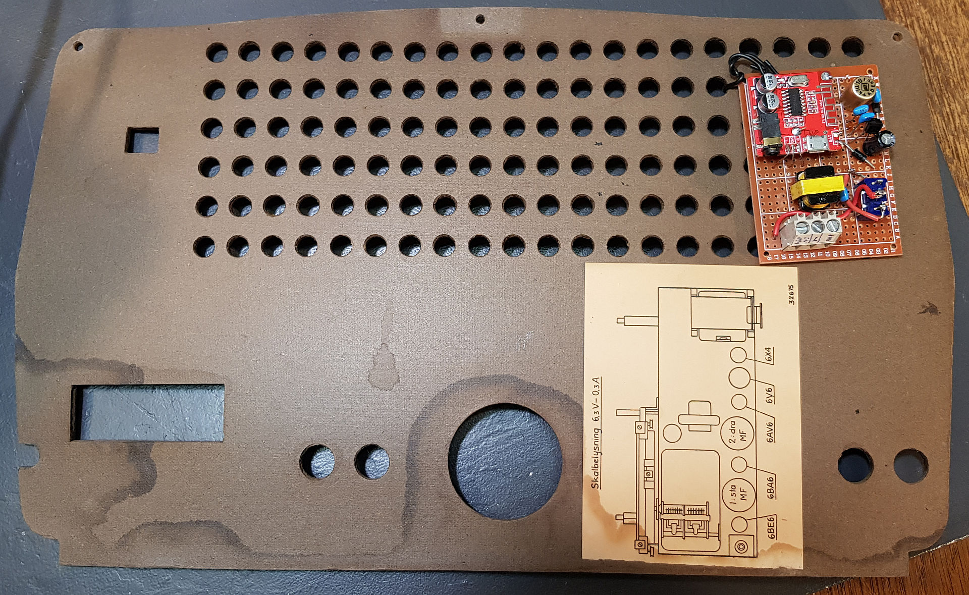 der Bluetoothempfänger ist eingebaut. Platz war nur auf der Rückwand. Dort habe ich ihn teils festgebunden, teils mit dem Gewinde des Kippschalters befestigt. Ich musste dazu die Rückwand nicht beschädigen, was mir sehr wichtig ist, um den Originalzustand durch einen Rückbau erhalten zu können.