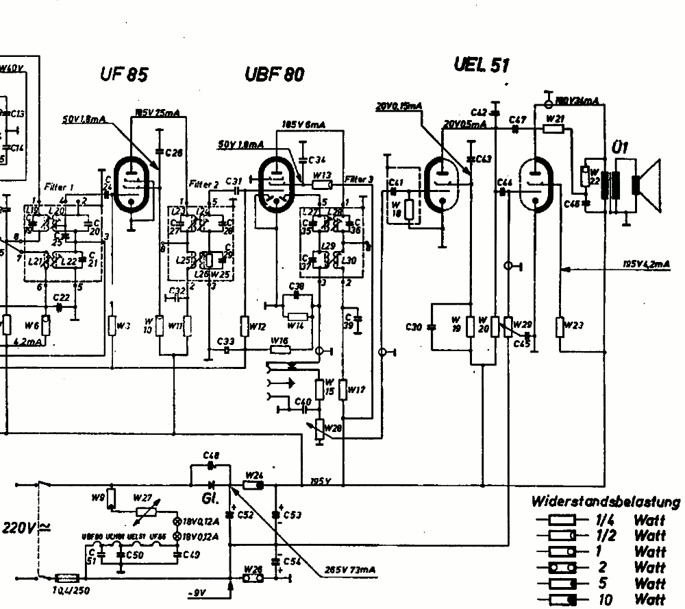 danke, an diesem Problem bin ich ja dran. C48 habe ich gewechselt. Die Spannung steigt auch über 260 V an wenn ich die UEL51 ziehe. Bei den anderen Röhren nicht. Also, kann es ja nur an der UEL 51 liegen??? . Ich werde mal den Widerstand W26 erhöhen damit ich mehr negative Vorspannung habe = weniger Anodenstrom UEL 51 ? Ach so, mir fiel noch auf, bevor ich angefangen habe, die Ausgangssituation war, das das Gerät etwas brummt (offener Eingang oder so) , in allen Wellenbereichen, als ob irgendwo Masse fehlt oder der Eingang offen ist. Ich werde mal einige Strommessungen machen müssen. Ich werde erstmal die C53 und 54 messen, vielleicht haben diese einen Feinschluß oder großen Kapazitätsverlust. Heute Abend.