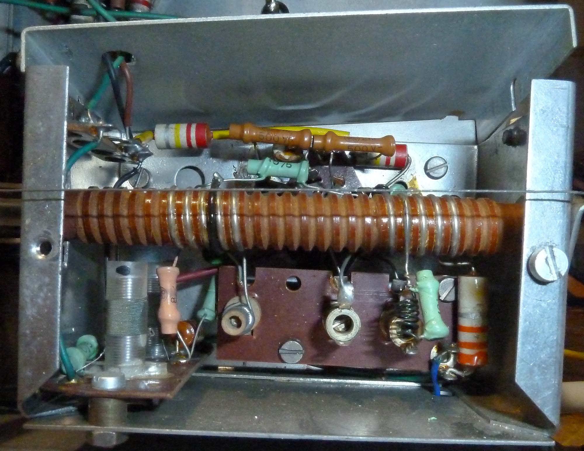 Er sieht recht übersichtlich aus, aber ein Bauteiltausch ist ziemlich mühsam, weil der Variometer-Spulenkörper im Weg ist. Bei der Prüfung kam dann noch heraus, dass der Siebwiderstand für die HF-Vorstufe zu hochohmig war (ca. +30%). Somit wurde der ersetzt. Bei der Messung der Anodenspannung stellte sich dann heraus, dass die Spannung an der Anode der HF-Stufe viel zu hoch ist, also die Röhre zu wenig Strom zieht. Da die Gitterspannung in Ordnung war, muss es an der Röhre liegen. Diese hat wie die übrigen originalen Röhren sehr viele Betriebsstunden, was man ihr auch ansieht, daher ist sie wohl etwas emissionsschwach geworden. Nach dem Ersatz stimmte die Spannung und die Frequenzsprünge und die Drift beim Einschalten waren weg, zudem wurde der Empfänger einiges empfindlicher (weniger Rauschen). Wenn schon, wurde als Ersatz eine ECC85 mit vergoldeten Pins verwendet, es ist schliesslich ein High-End-Radio