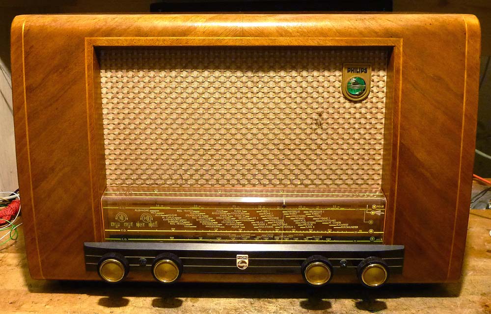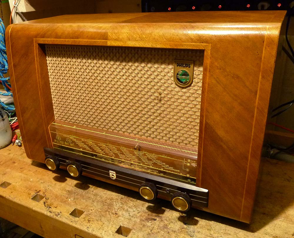 das Radio ist wieder zusammengebaut und glänzt fast wie neu. Die EL41 machte noch Probleme, da ist irgend etwas faul, vermutlich hat sie inneren Wackelkontakt. Daher habe ich kurzerhand die aus meinem Paillard geklaut, jetzt funktioniert er sehr gut. Eine neue EL41 ist bereits im Anflug. Auf UKW ist er jetzt bei schwachen Sendern deutlich lauter, offenbar war die EL41 das Problem, nur fiel es nicht auf, weil auf AM und bei stärkeren UKW-Sendern der NF-Pegel ausreichend hoch war, und ein baugleiches Gerät war nicht gerade verfügbar Der Klang ist gut, durch den grossen Lautsprecher mit kräftigem Bass, für die Höhen wäre ein zusätzlicher Hochtonlautsprecher die Abrundung, aber den kann man ja auch extern anschliessen.