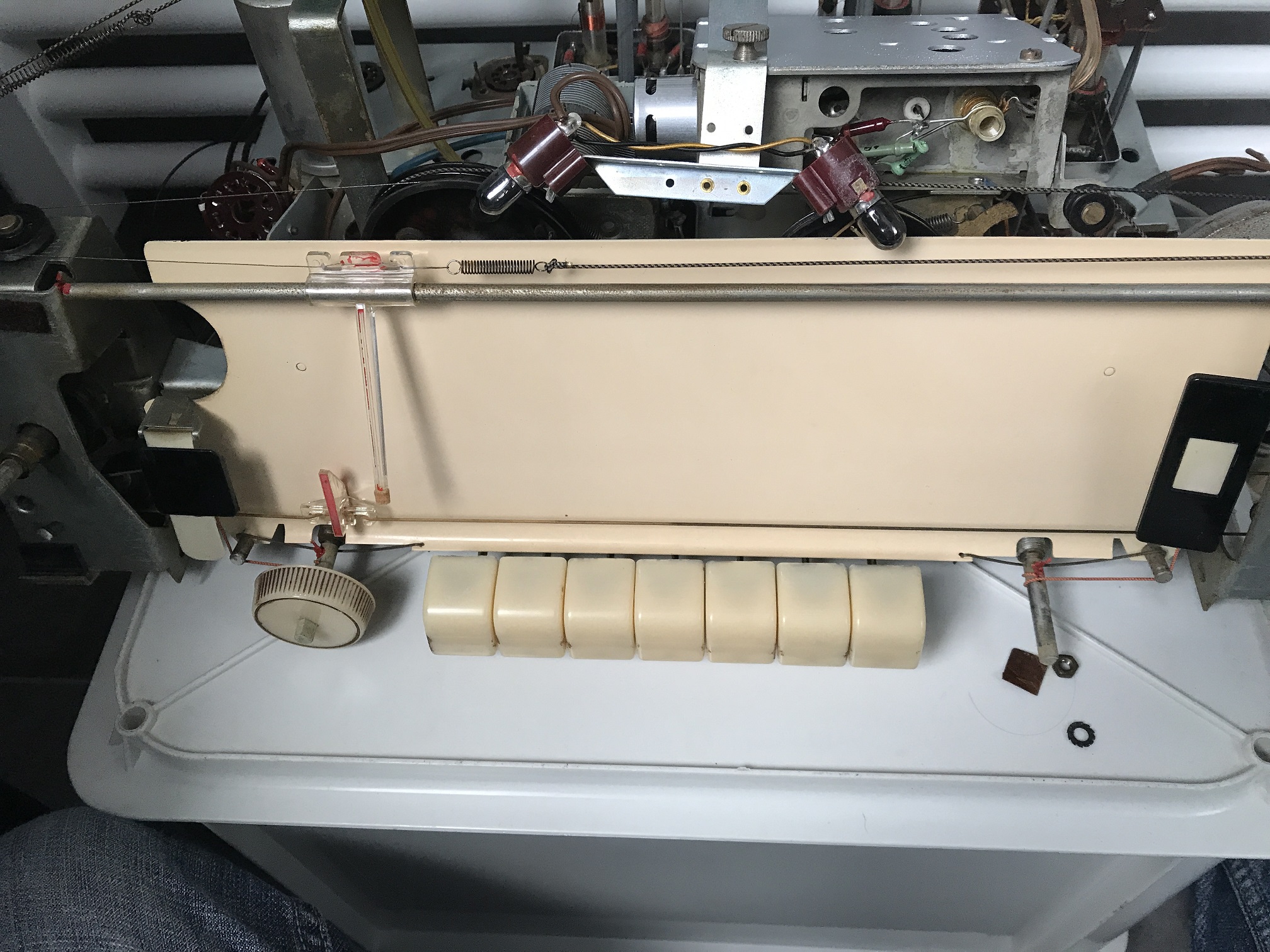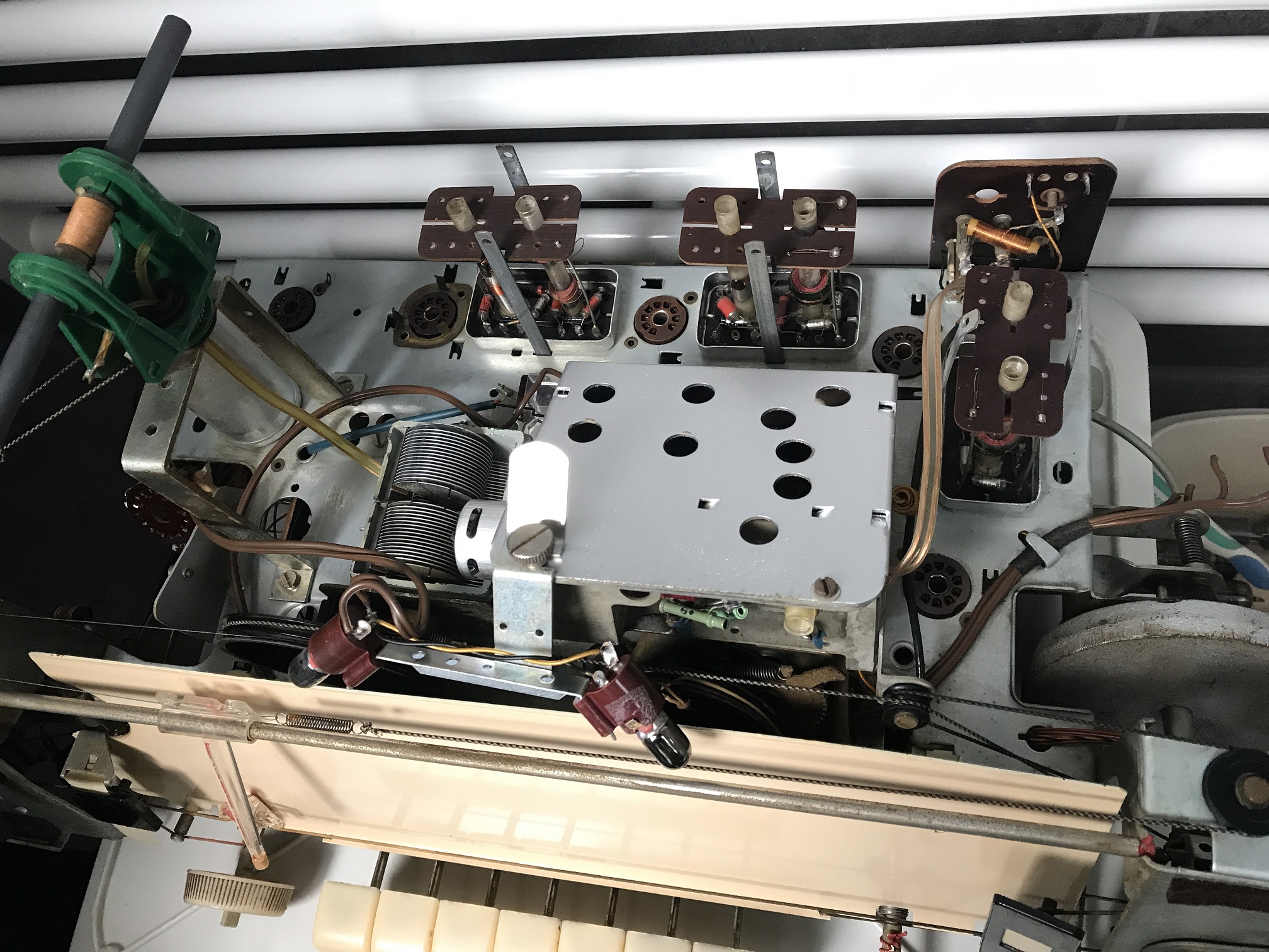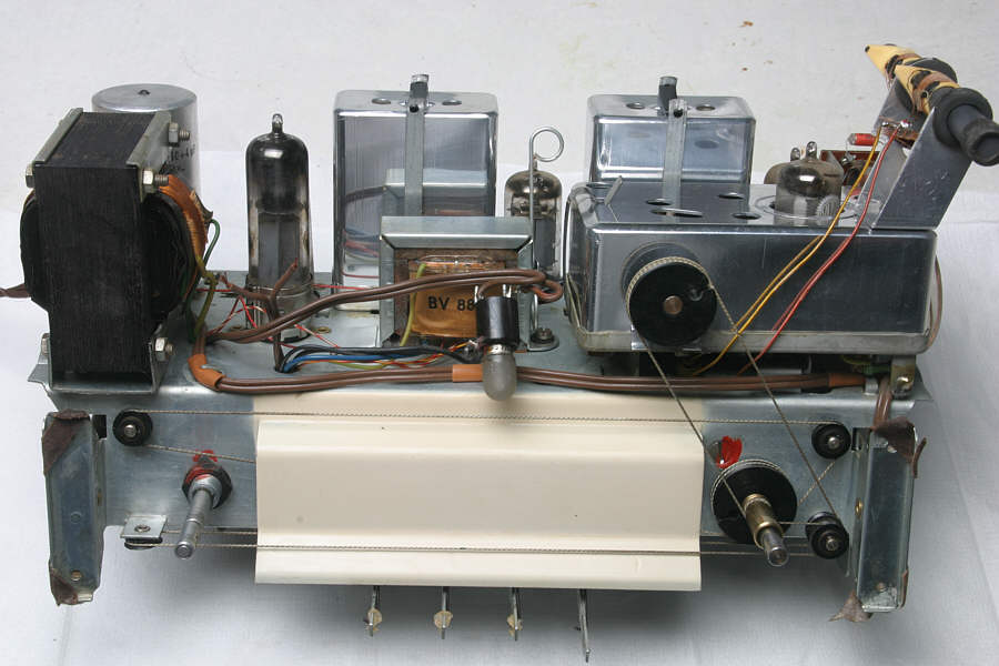 Also normalerweise hänge ich die Röhren kopfüber in Spülmittelwasser (nur die Röhren ohne Außenbeschichtung! also Noval, Rimlock, Oktal...) sodass der Sockel nicht nass wird. Der Schmutz lässt sich dann ganz leicht abwischen, man muss nur bei der Beschriftung aufpassen. So wie auf dem Bild gezeigt mache ich das nicht mehr, in dem Fall wäre es kein großer Verlust weil die Röhren mit hoher Wahrscheinlichkeit sowieso verbraucht sind. (Verfärbungen am Glas, das Gerät ist sehr viel gelaufen. Siehe auch die verspiegelten Glühlampen)