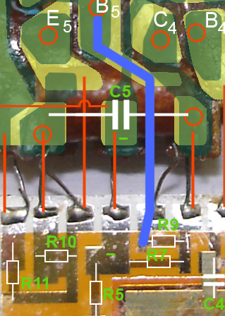 Guck Dir mal die blaue Linie an. Das ist die Verbindung von der Basis des T5 zur Dünnschichtschaltung. In dieser führt aber nur ein einziger Widerstand weg, nämlich der R5 von der Basis T5 zum Kollektor T4. Anderseits würde der von Dir erwähnte Widerstand wenig Sinn machen, denn die Basis von T5 bekommt den Arbeitspunkt über R5 geregelt. Wo sitzt denn dieser 4,5 k Widerstand bei Deinem Micro?