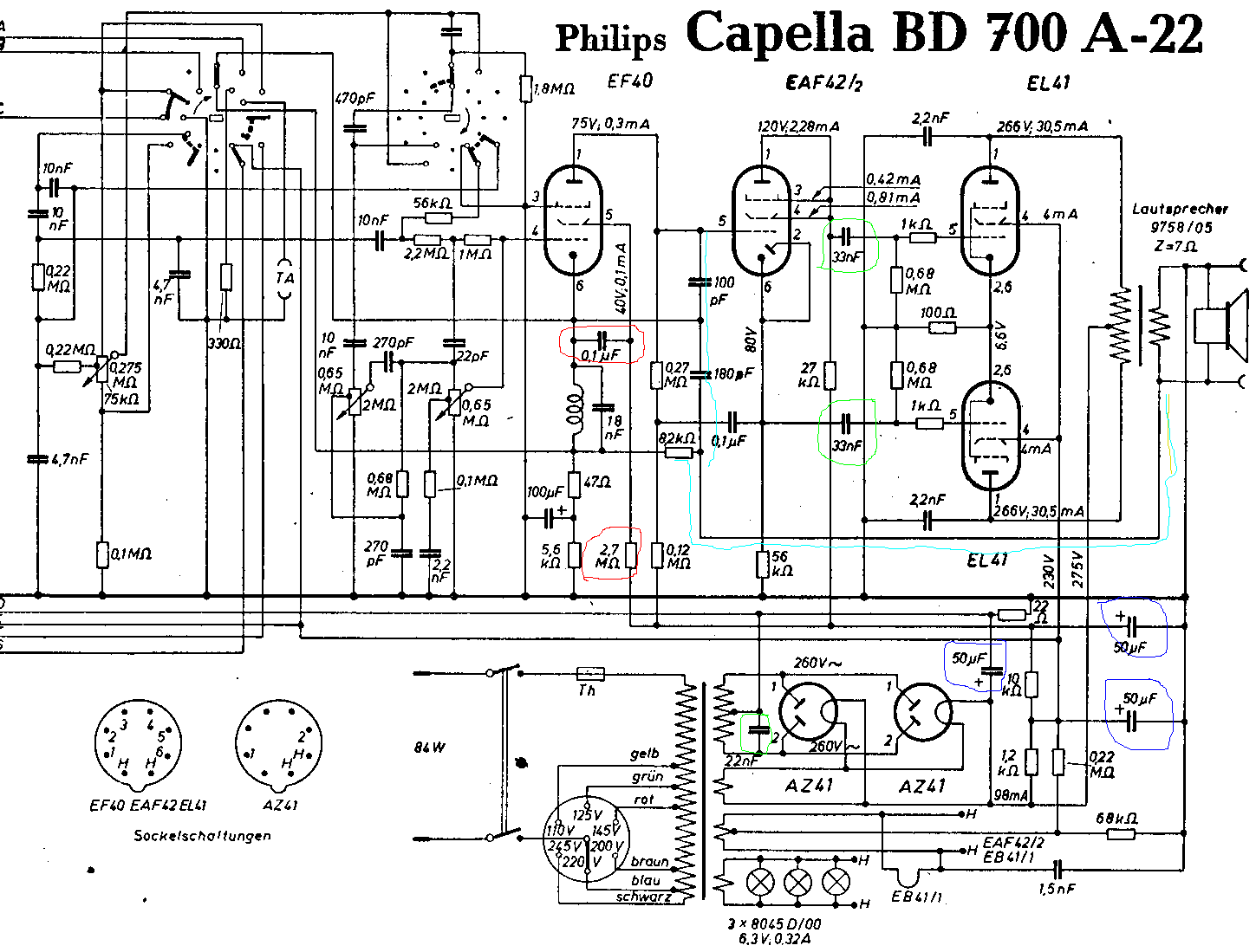 Es könnte auch die Endstufe, eine Gegentaktstufe für das Brummen verantwortlich sein. Die Schaltung ist relativ einfach. Bei einer GE Endstufe würde die Restwelligkeit sich von selber kompensieren im AÜ. Im Grundprinzip könnte man von einer Brückenschaltung sprechen. Wenn die beiden EL 41als speisende Generatoren mit einem bestimmten Ri annimmt, ist klar das beide gleich sein müssen. Das wird nach zig. Jahren nicht mehr der Fall sein, die sind nicht mehr "matched". Die Schaltung hat keine Möglichkeit zur getrennten Bias Einstellung, die Endstufe ist Strom und Spannungsgegengekoppelt. Strom GK durch den 100 R, nicht mit C gebrückt; Spannungs GK über die beiden 2,2 nF von Anode zu Gitter. Diese beiden bitte prüfen oder besser wechseln! Der Phasensplitter ist die als Triode geschaltete EAF 42, klar das auch hier alles so wie im Schaltplan angegeben sein muss, da sonst die Ansteuerung nicht symmetrisch erfolgt. Ich würde trotzdem die Netzteilelkos tauschen um hier erstmal klare Verhältnisse zu haben, dann die Spannungen messen an dem Anoden der EL 41, die müssen ziemlich gleich sein. Neue EL 41 sind nicht Superbillig, zwei neue wären das beste. Ein gut restauriertes Gerät wie Dieses wird aber immer wertvoller werden. Da sehe ich noch den 100 µf in der Katodenleitung der EF 40, der ist mit Sicherheit nach meiner Erfahrung zu wechseln. MFG Nobby