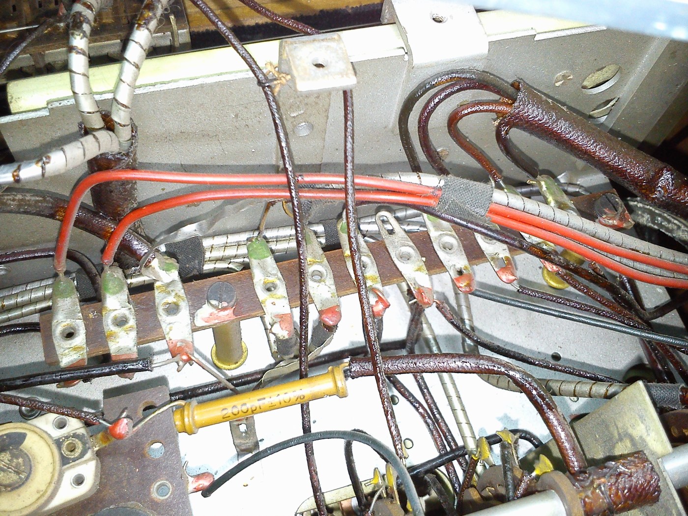 Aber erstmal weiter mit der Bestandsaufnahme. Heute habe ich das Chassis ausgebaut. Wie anderswo schon beschrieben, ist es das wichtigste erstmal das Skalenseil vom Zeiger zu lösen, sonst reisst es beim Ausbau des Chassis. Dann die Kabel zur "Schallwand" lösen, am besten an der zentralen Lötösenleiste. Es tut schon etwas weh, die lackgesicherten Lötstellen zu entweihen, aber was soll's...: