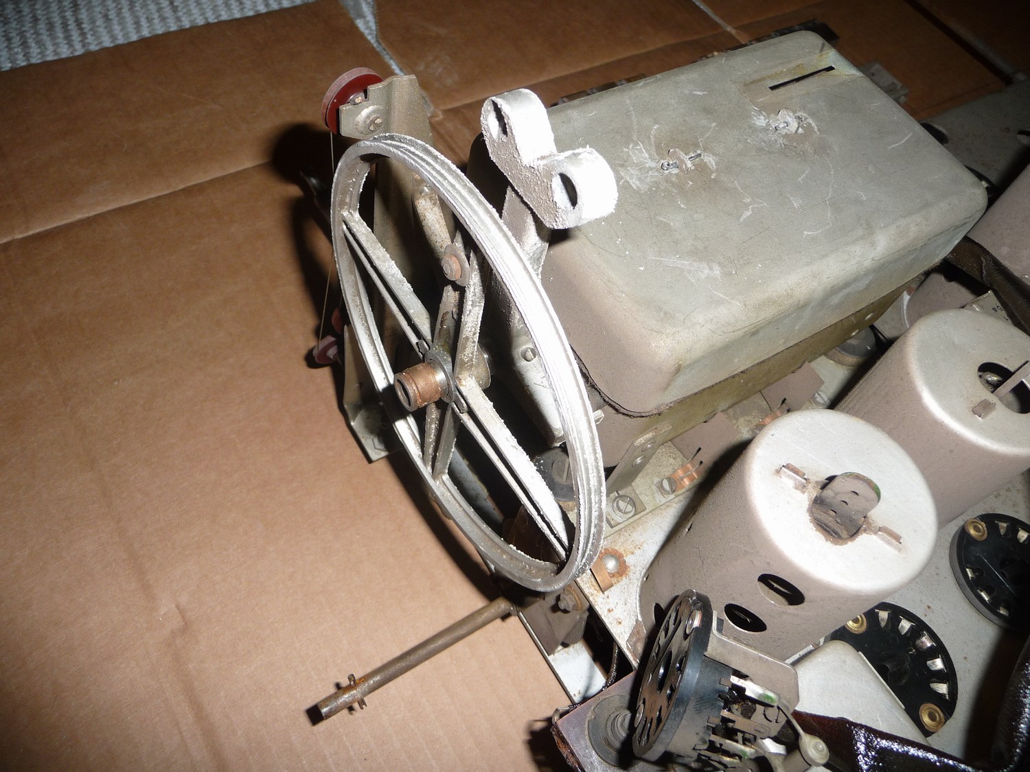 Nein, die beiden Umlenkrollen sind nicht das Problem, die könnte ich auch aus einem x-beliebigen toten Radio nehmen. Aber der Telefunken hat originalerweise ZWEI von den großen Seilscheiben mit den vier Speichen. Dort möchte ich auch gern wieder die beiden originalen Skalenräder dran haben. Hier gehört es hin: