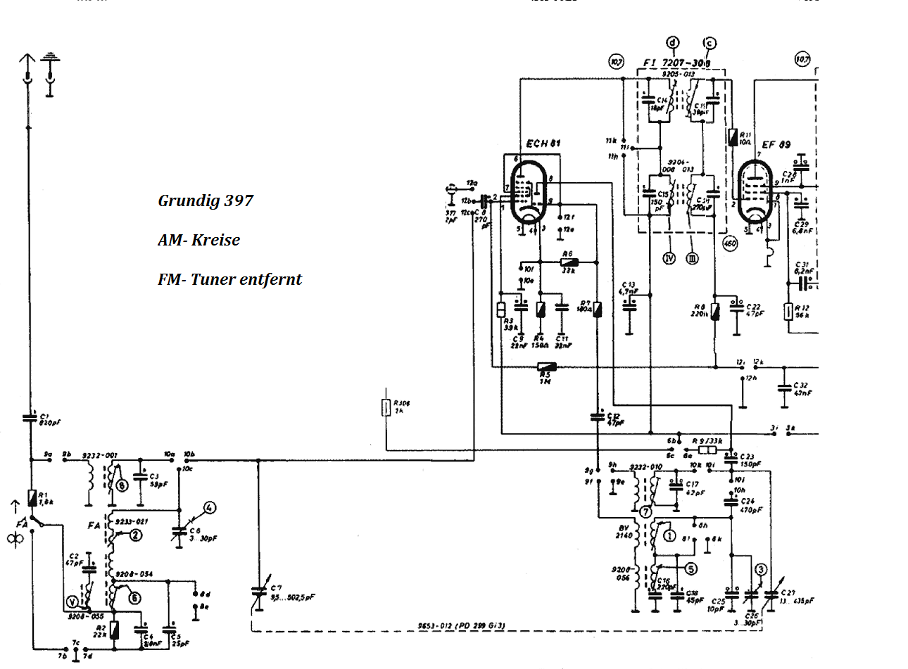 Also KW läuft ja prima und ist sehr empfindlich und trennscharf. Es ist ja nicht einmal ein Stückl Antennendraht eingesteckt! Warum sollten die anderen AM- Bereiche weniger empfindlich sein? Sind ja prinzipiell ähnliche Schaltwege zur ECH81. Die ECH81 habe ich auch schon ausgewechselt....kein Unterschied! Also da ja bei mir am Tage keine Ortsender vorhanden sind, setzte ich meinen Mess- Sender ein und koppelte über eine 290uH Spule die entsprechende Frequenz bei 150kHz, 250kHz,350kHz für LW und 520kHz, 1MHz und 1,6MHz für MW ein. Modulation 1kHz. Ja Abstimmung funktioniert...aber merkwürdigerweise kann ich die letzten verbliebenen LW Stationen, welche mit einem einfachen Taschengerät zu empfangen sind, nicht erfassen. Es fehlt auch das komplette Hintergrundrauschen, Störfrequenzen aus der Umgebung usw... Fahre ich meinen Laptop hoch oder mache ich die LED- Tischlampe an, ist aber ordentlich Krach in der Kiste. Heute in der Abendphase will ich mich auf den AM- Empfang konzentrieren und mit einem Referenzradio vergleichen. Irgendwas stimmt noch nicht. Hier mal ein weiterer Ausschnitt für die AM- Kreise des 3097.