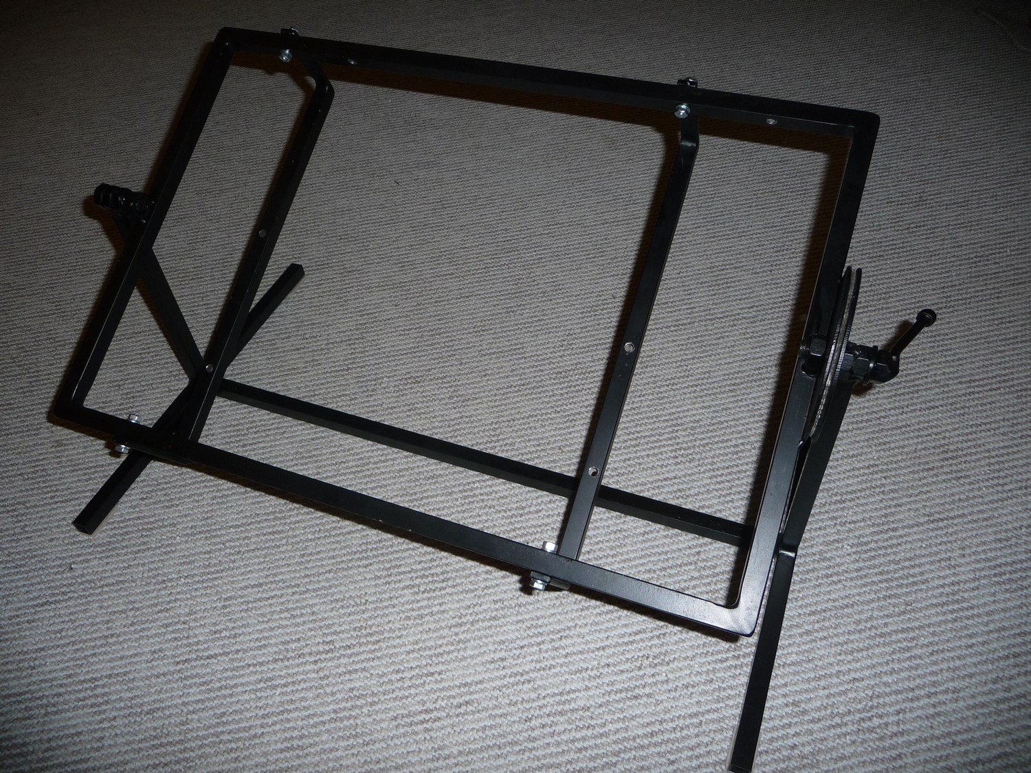 Wichtig war mir, das der Schwenkrahmen in jeder Stellung fixiert werden kann, deshalb habe ich eine Bremse bestehend aus zwei Metallscheiben mit zwischengelegter Gummischeibe vorgesehen. Durch festziehen der Knebelschraube wird die Bremse angezogen.