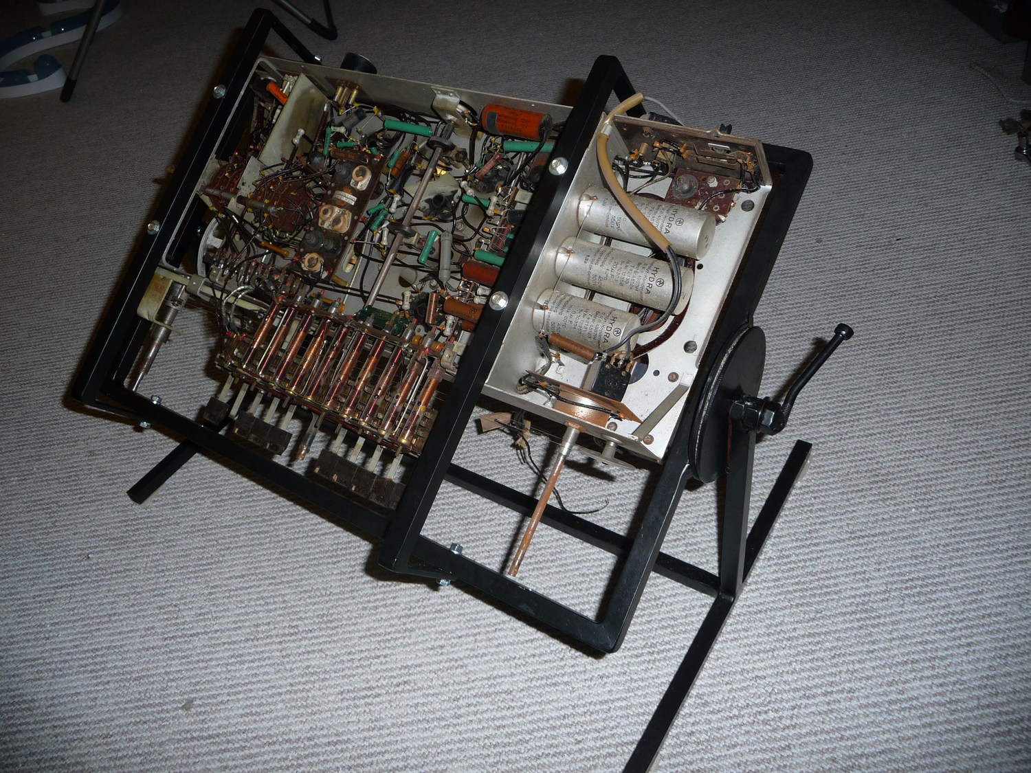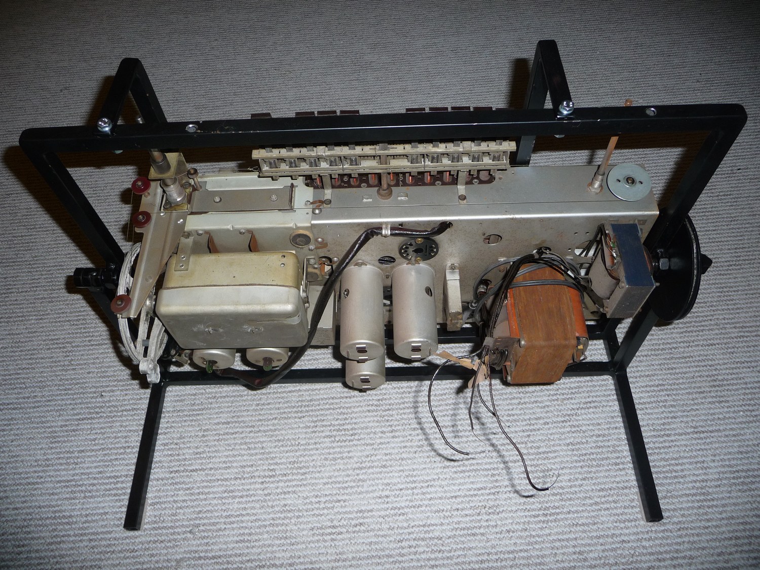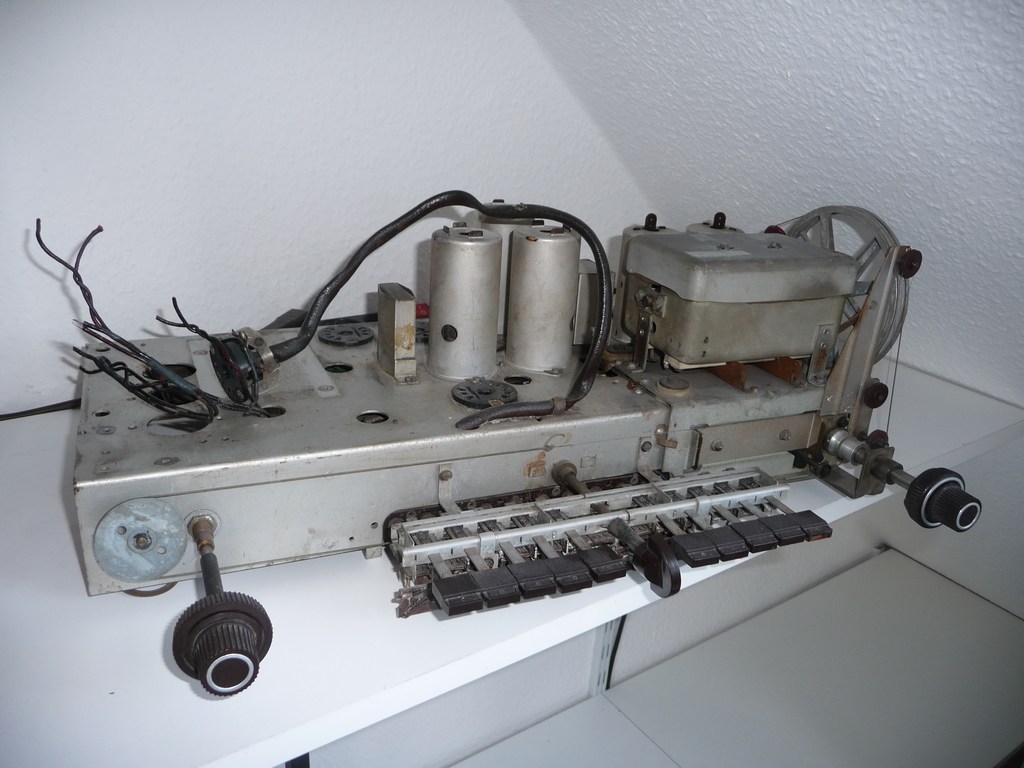 Im Kaufpreis enthalten war auch noch ein NF-seitig recht verbasteltes Chassis mit fehlendem Netz- und Ausgangstransformator. Aber die beiden Trafos habe ich ja auf meinem Chassis. Viel wichtiger ist jedoch, das die Skalenseilführung komplett ist und beide großen Seilscheiben dabei sind. Auch alle Tasten und Drehknöpfe waren dabei.