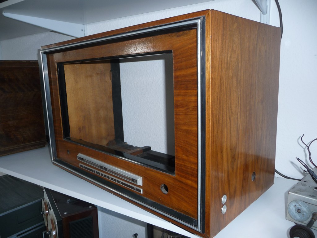 Somit konnte ich für einen humanen Betrag ein Schlachtgehäuse -in einem für mich absolut wohnzimmertauglichen Zustand- erwerben. Mit dabei waren auch die Schallwand und (leider) nur die beiden oberen Skalenstreifen.