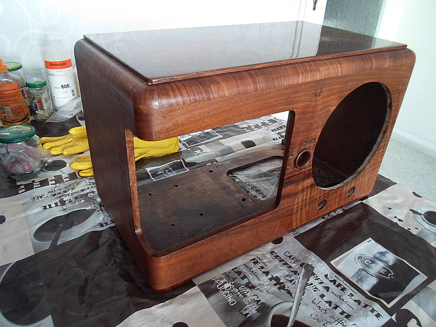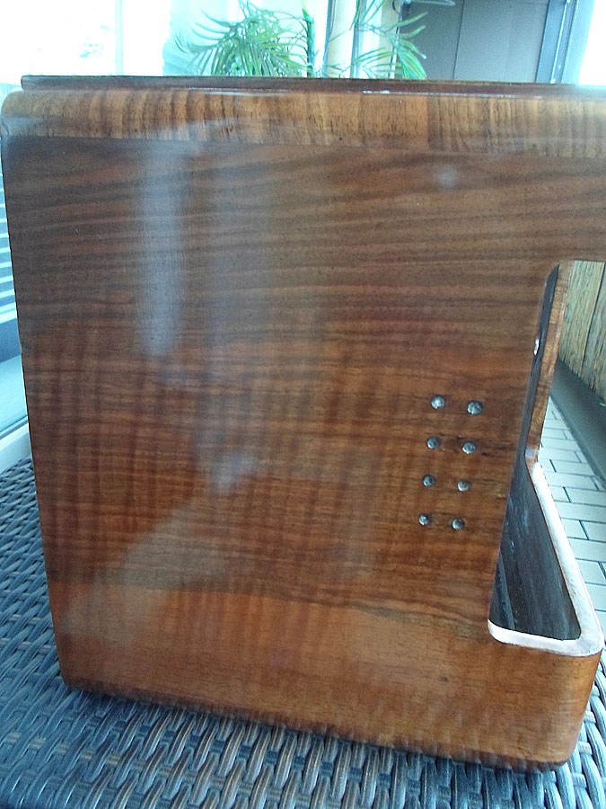 Wie ich habe schon oben geschrieben, nach erstem Lackieren, neben den gebildeten Flecken, hat mir auch die zu glänzenden Oberfläche nicht gefallen. Die war einfach nicht passend zu dem Radio, einem Gerät der 30er Jahre. Schuld war der Lack, ein HS 2K. Deswegen habe ich den Lack komplett runter gezogen und alles mit Französische Politur angefangen. Das ist eine Technologie und der Lack aus den damaligen Zeiten. Ich bin 100% sicher, dass so ein Gerät wie das Radio, damals hat nicht schlechter ausgesehen, als ich das jetzt mache.