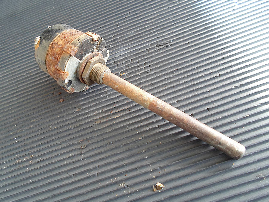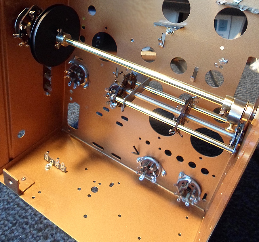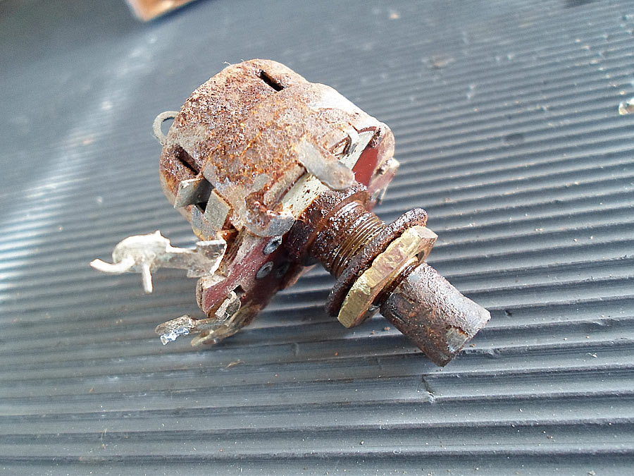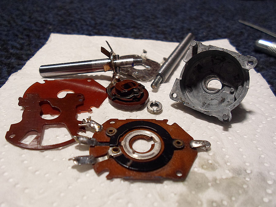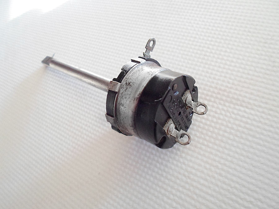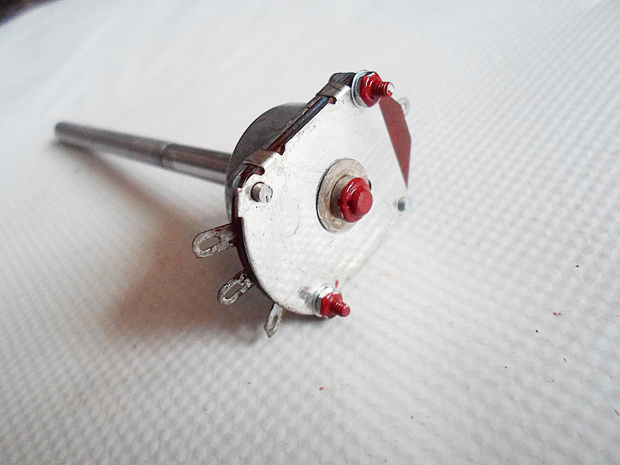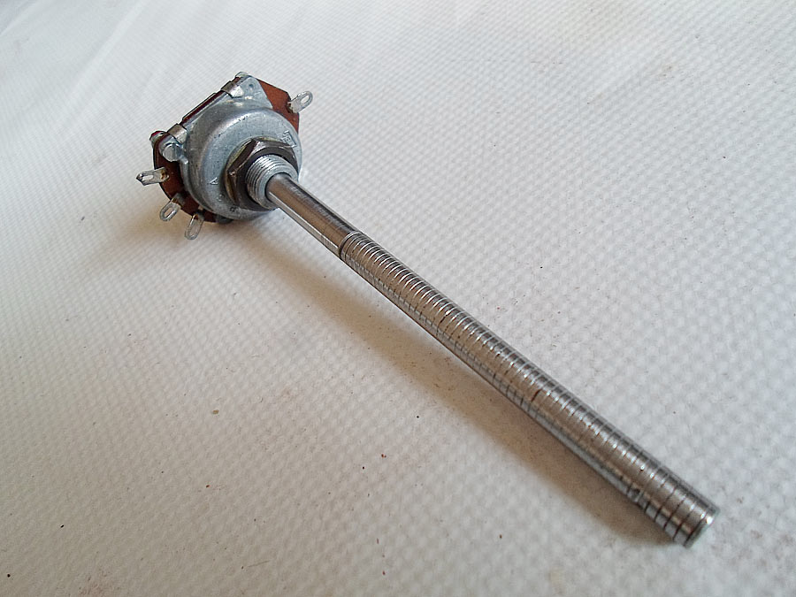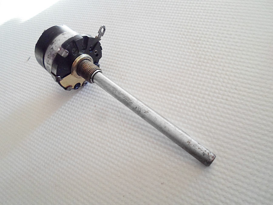 Dan kam auf mein Tisch der Lautregler. Das Poti war von Anfang an schon Schrott. Restauration hat hier kein Sinn gehabt. Ich habe ein anderes passendes gefunden& das war ein 3 x fach, und umgebaut. Problem war hier das die Achse bei dem Poti soll 75mm lang sein. Ich habe die Achse einfach nachgerüstet. Die Gewinde habe ich mit Flüssigem Metall fixiert.
